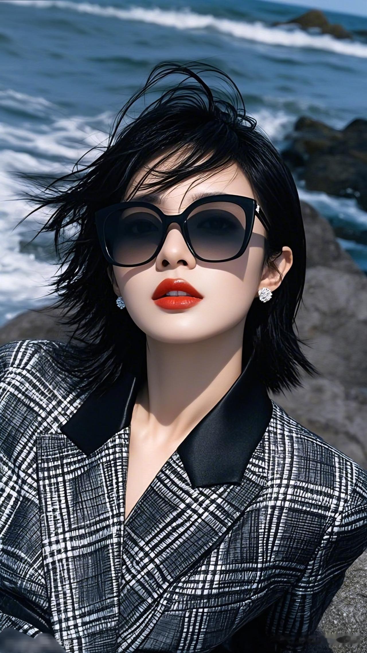 海风吹拂,墨镜遮面,红唇轻启。有哪些美女让人过目难忘? 海边时髦女郎,黑发红唇,黑白格纹外套,墨镜闪耀,海风轻拂。