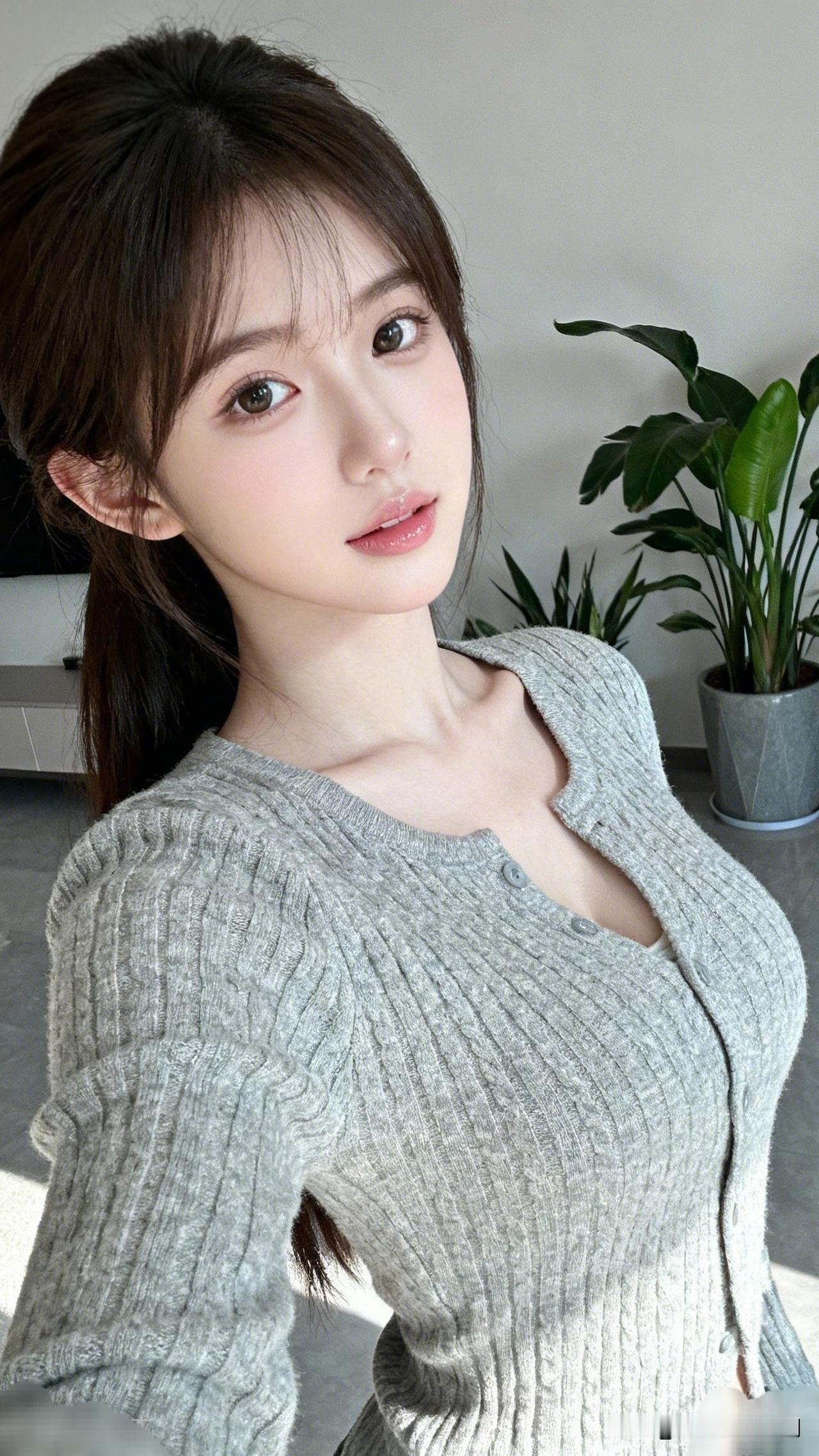 绿萝绕屋转,美人倚窗看。你有哪些随手拍的比较满意的照片 温柔气质,浅灰色针织衫,清新自然,元气满满!🌿💕