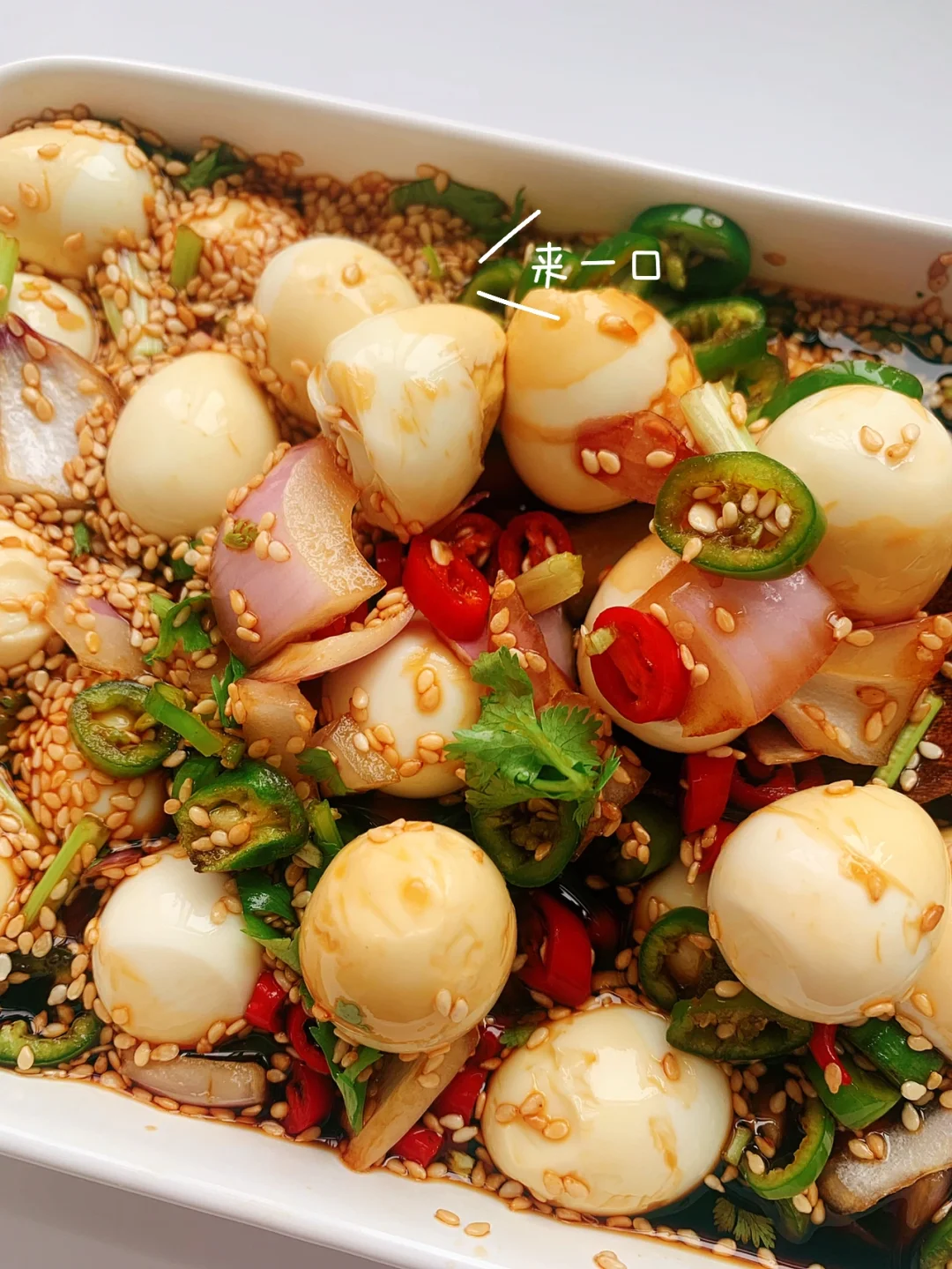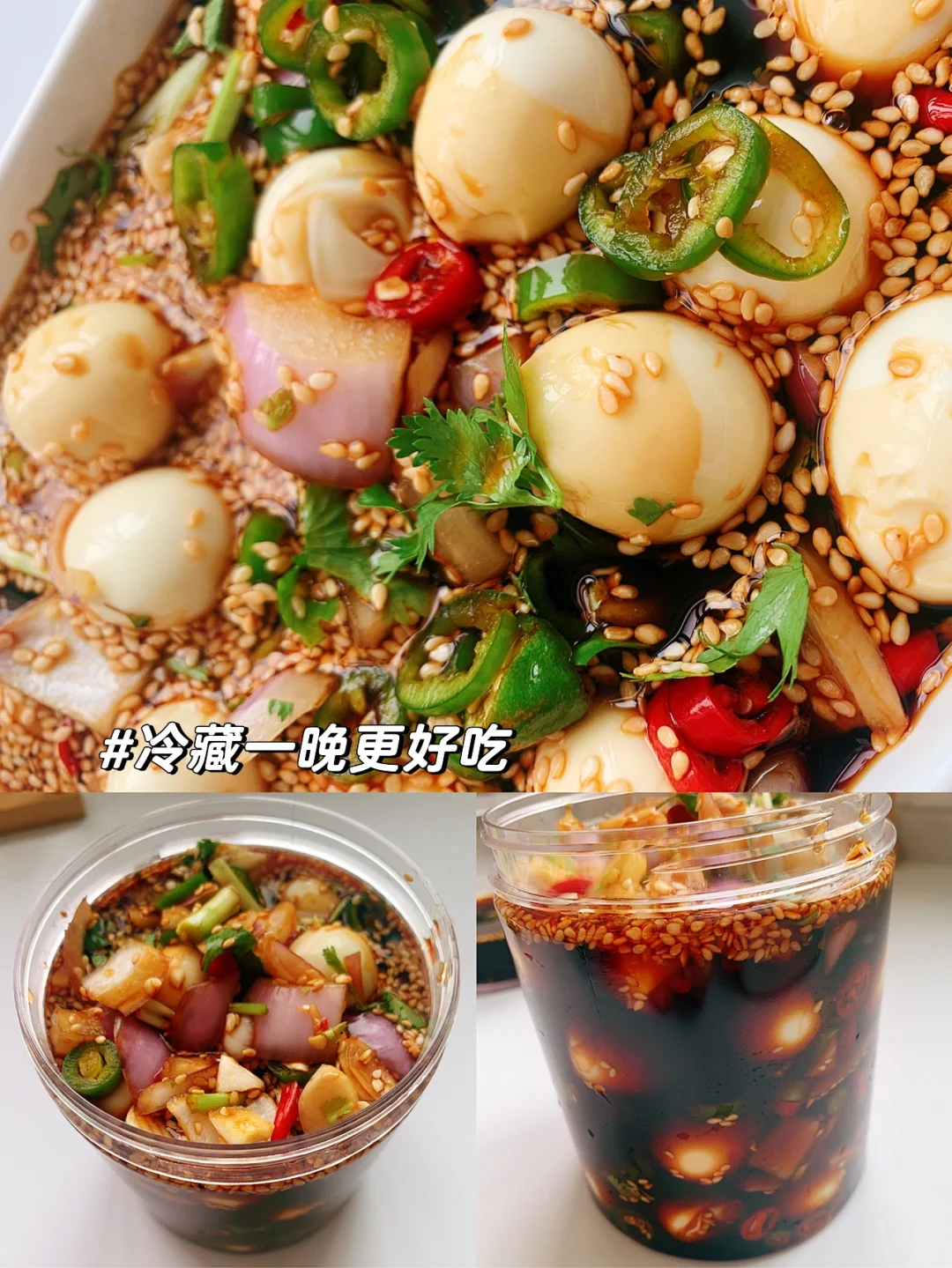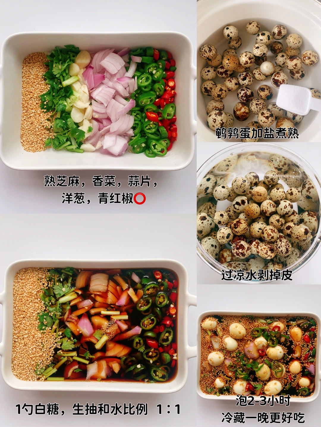 果然没让我失望,好吃好吃太好吃了。没有一滴油,拌饭绝绝子,嘎嘎香。 [飞吻R]hi,又是快乐的一天呀❗ 今天分享【酱鹌鹑蛋】 食材:鹌鹑蛋,洋葱🧅,青红椒🌶🫑,蒜片🧄,香菜📝做法: 灵魂料汁:白芝麻(熟),香菜,蒜片,洋葱,青红椒圈⭕,一勺白糖,生抽和水的比例1:1。 ✨✨鹌鹑蛋冷水煮熟,过冷水剥掉皮,泡到料汁中,2-3小时后就可食用。冷藏一晚味道更好❗❗ 强烈建议大家试一试,不好吃算我输。我用它拌了藜麦饭,香惨了呢[偷笑R][偷笑R][偷笑R]