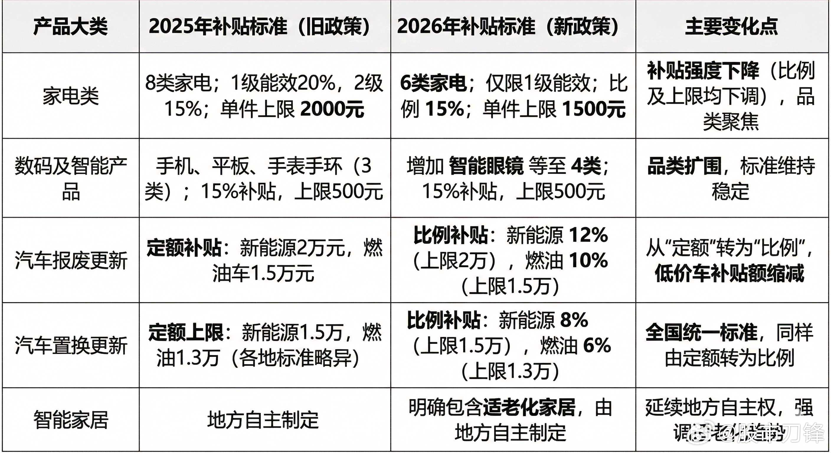 2026年国补新政落地,刀锋看了下,主要的变化有几个:1、汽车。之前是固定金额补贴,现在改为按车价比例补贴;简单理解,车价越高,补贴上限拿的越多!从比例看,以旧换新买新能源车,补贴比例8%,不超过1.5万;报废更新买新能源,补贴比例12%,不超过2万。金额跟2025差不多,不过明年新能源车要多一个购置税,整体上买车负担加重了。2、家电。只补贴冰箱、洗衣机、电视、空调、电脑、热水器这6类,必须是1级能效或水效,补售价的15%,最高1500元。2025年补贴8类家电,包括1级2级能效,很显然,家电补贴强度也下降了。3、数码智能产品:手机、平板、智能手表(手环)、智能眼镜等4类产品可补。价格6000以下、单人单件最高补500,标准没变。4、智能眼镜首次纳入“国补”。这个变化是向市场释放明确信号,“人工智能+消费”将获得政策重点支持。5、新增电梯、消防等民生设备。比如,老旧小区加装电梯、养老机构设备更新、消防救援设备更新也都是首次纳入补贴,体现了对民生的重视!总结就是,我们钱要花在刀刃上,给老百姓换车、换家电、买手机实实在在真金白银的补贴。同时对产业而言,重点是人工智能+消费、绿色消费,这也是A股2026的机会所在!对了,第一批625亿元资金已提前下达,大家元旦假期可以去买买买了。
