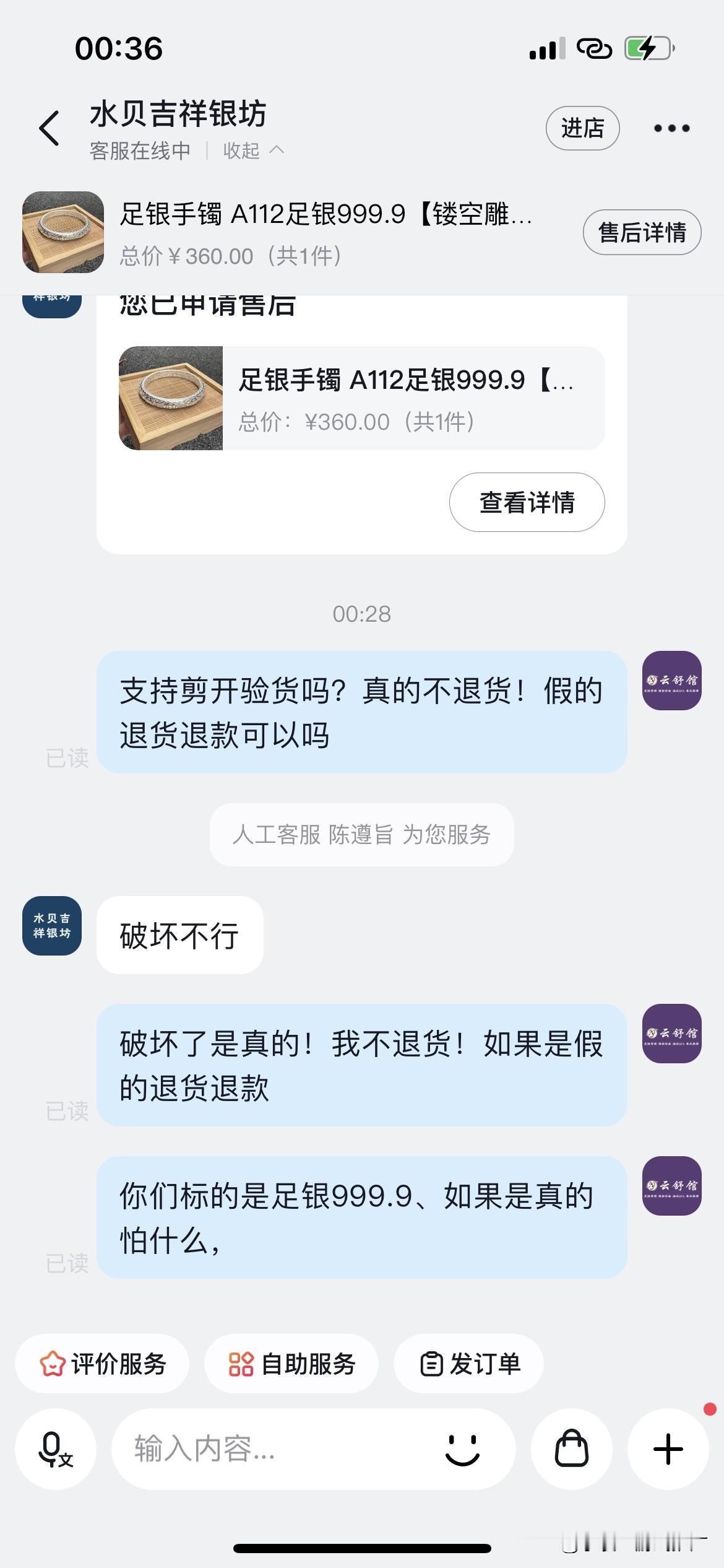 假的!假的!假的!千万不要买!! 这个就是我直播间买的手镯,一克10块钱! 怀疑是假货!已经低于大盘价了! 我问客服“剪开不是足银的,可以退货吗” 客服“破坏不行”就是不能破坏😅 “破坏了是真的!我不退货!如果是假的退货退款,你们标的是足银999.9、如果是真的怕什么,” 我又没说假一赔十[呲牙] 最后果断退货了!如果是真的我想怎么验货都不怕,毕竟真银不怕火验 如果是你们会怎么做?