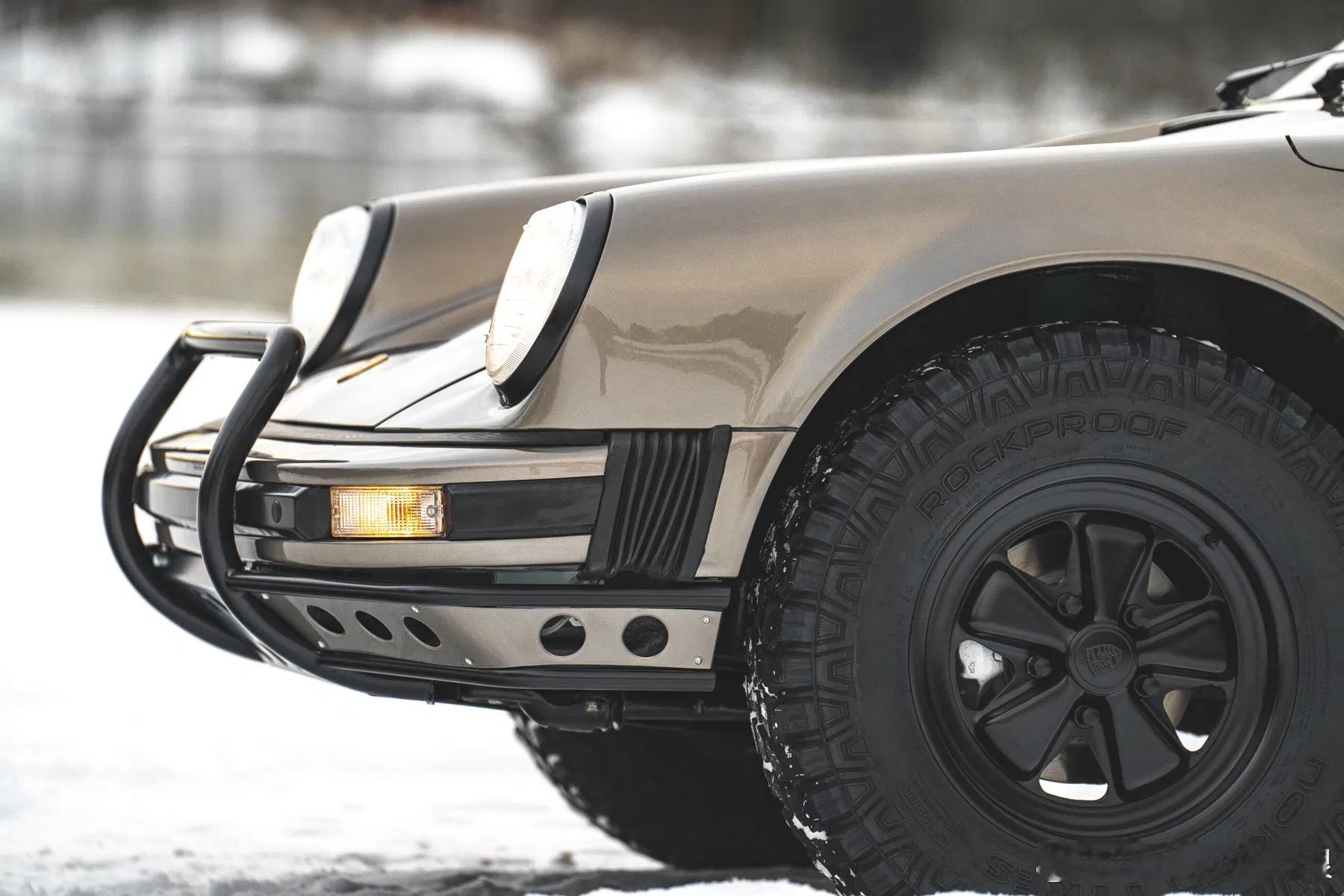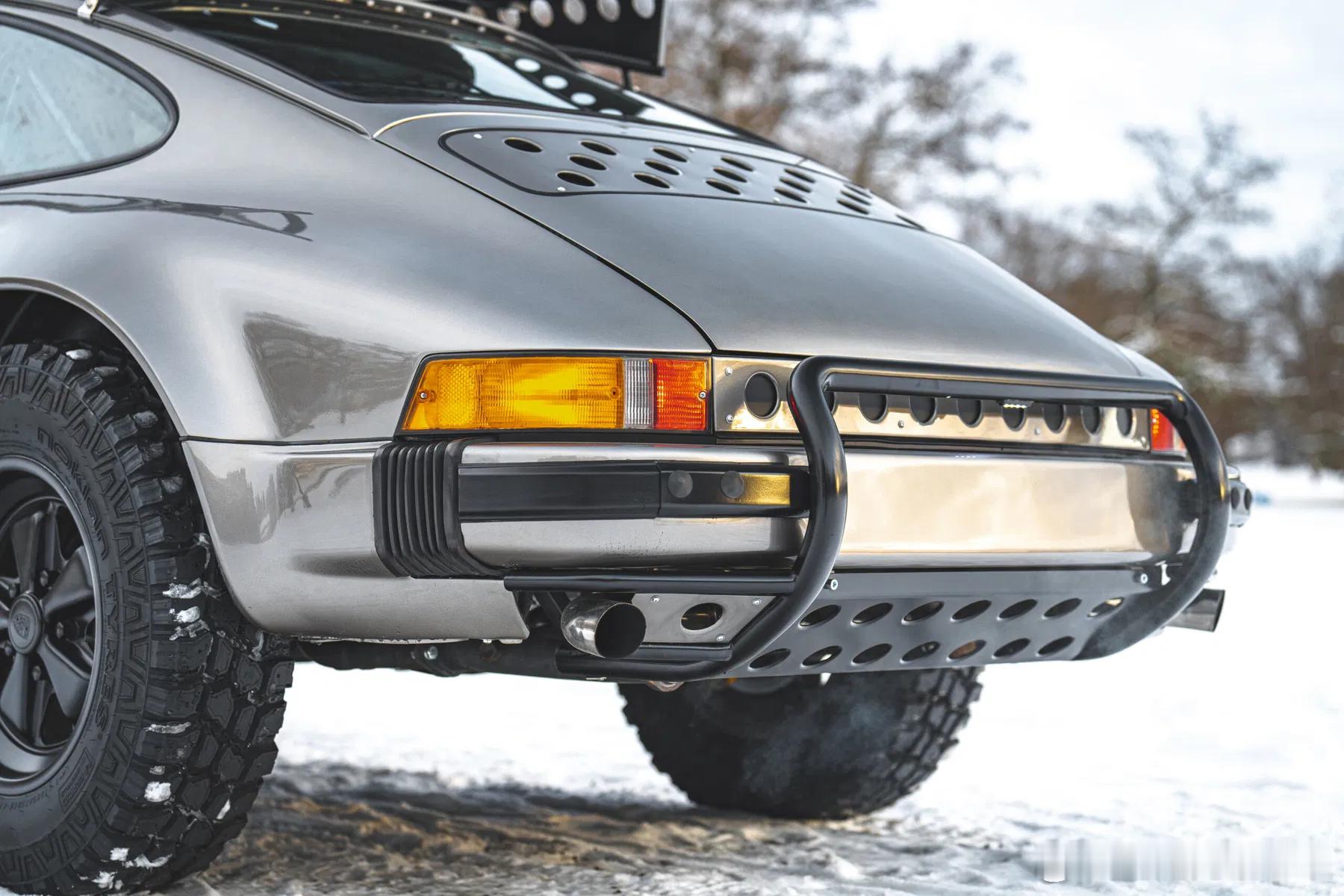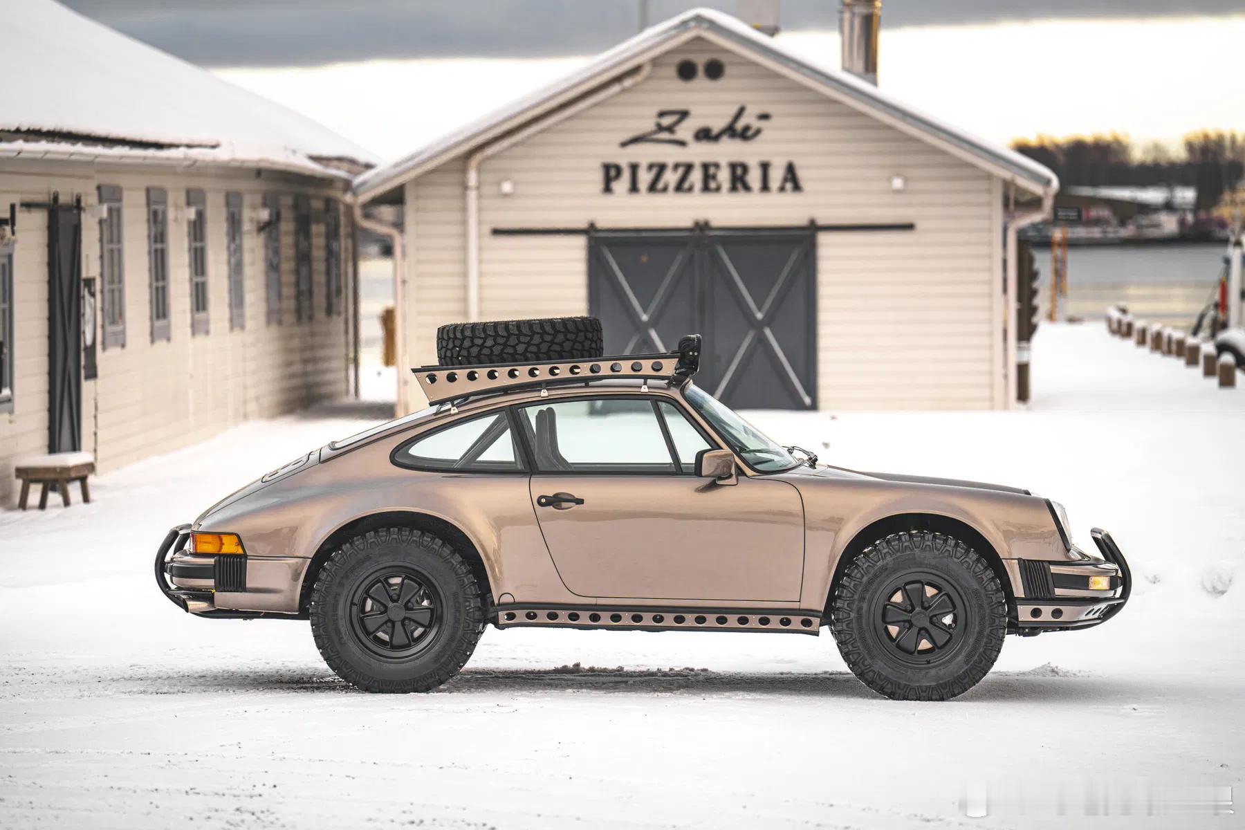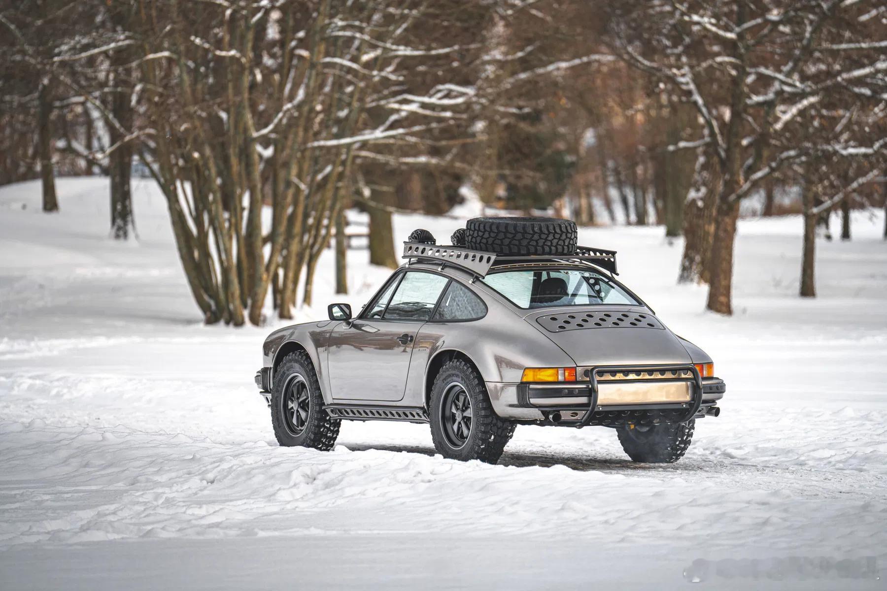 大V聊车 又是一辆保时捷911 Dakar爱好者无法抵御的Safar风格保时捷911改装车,由芬兰KiveriöCustoms Oy改装团队打造。这辆车采用了一辆1980年的930保时捷911 Carrera为基础,动力还是原厂配备的3.0升水平对置6缸风冷发动机。这台早期的6化油器发动机最大功率201马力,匹配5速手动变速箱后轮驱动。尽管动力参数并不亮眼,但保时捷911后置布局高效的动力传输,加上轻盈的车身,还是有着不错的行驶表现。改装团队为这辆车换装了长行程悬架摆臂,以及Bilstein的拉力减震套件。并且还为了能够容纳下225/75R16的肥胎,将4个翼子板进行了切割和重新造型。车顶加装了根据车身弧度制作的顶架,还配合侧裙板使用了圆孔造型的侧围板。车顶框不仅将大号的AT备胎顶在了头上,还装上了3只越野辅助灯,看起来很有点拉力范。车内基本保持了原厂风格,只是换装了MOMO的经典三辐方向盘,及Recaro的桶椅,还配上了TRS的4点安全带,特别是这个车内都嵌入了定制的防滚架,不仅增加了安全性,也提升了视觉效果。车外同样增加了前后的定制拉力护杠,让视觉效果充满野性的同时,防护能力也大幅提升。同时,改装团队还为这辆车换装了Turbo Thomas排气系统,带来了更为深沉悦耳的排气声浪。