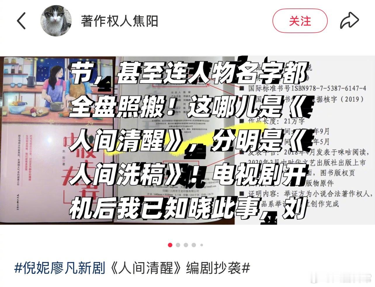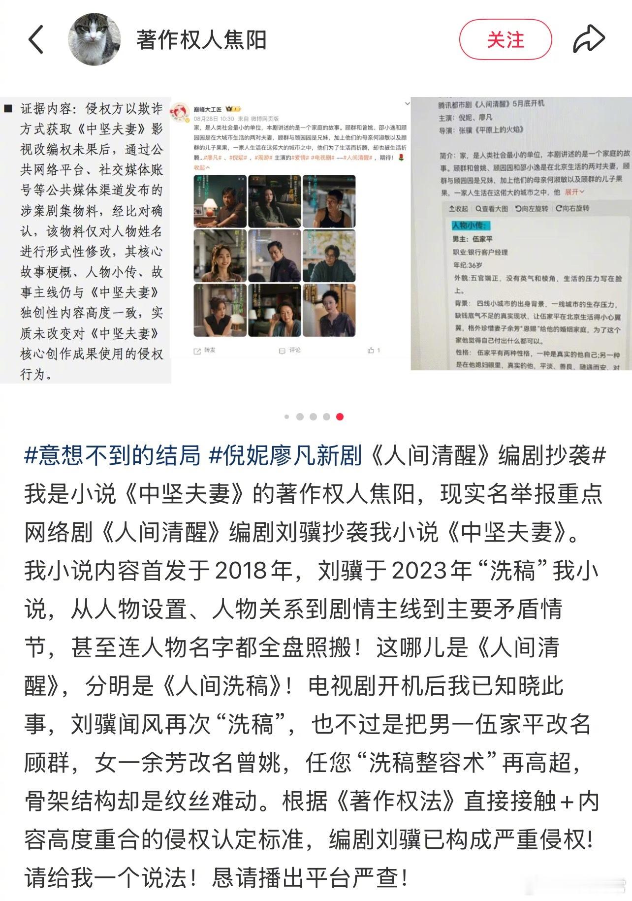 作者焦阳发文称廖凡、倪妮新剧《人间清醒》编剧刘骥抄袭自己的小说《中坚夫妻》