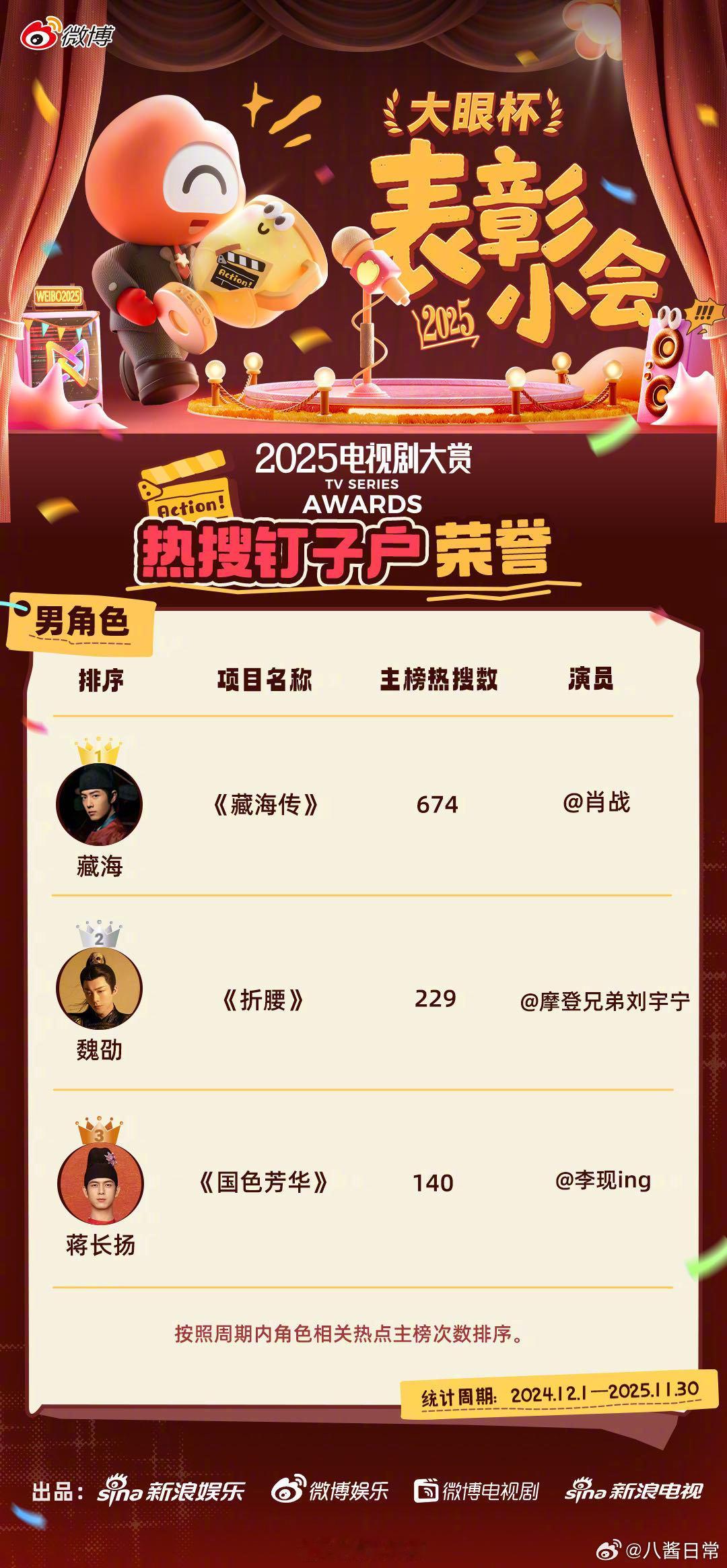 电视剧大赏年度热搜角色年度男角色TOP1:肖战《藏海传》藏海TOP2:刘宇宁《折腰》魏劭TOP3:李现《国色芳华》蒋长扬年度女角色TOP1:杨紫《国色芳华》何惟芳TOP2:杨幂《生万物》宁绣绣TOP3:白鹿《白月梵星》白烁/星月肖战刘宇宁李现热搜钉子户杨紫杨幂白鹿25年度热搜女角色TOP3