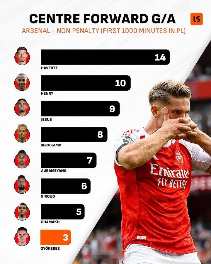 在阿森纳队史所有中锋球员中,约克雷斯在前1000分钟联赛出场时间里参与进球次数最少,伤愈复出的哈弗茨则最多 英超联赛 阿森纳著名教授