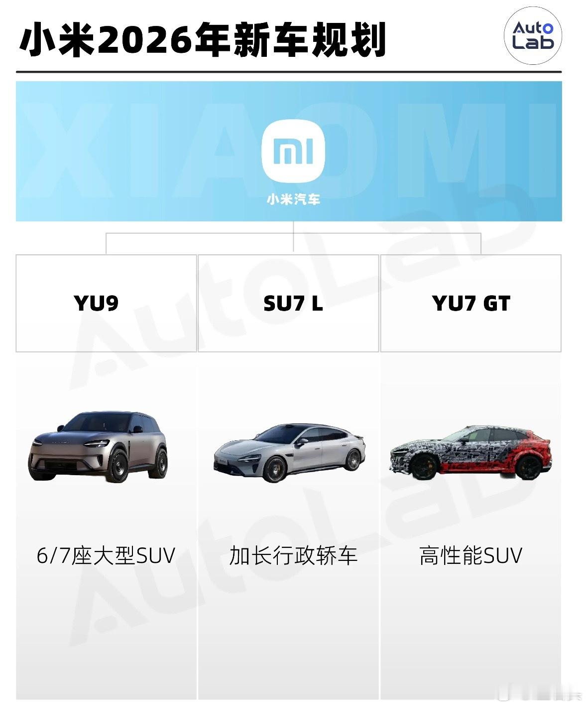 小米明年或推4款新车 定了!2026年小米将推出4款车型,分别为SU7改款、SU7行政版、以及一款增程五座SUV和一款增程七座SUV。其中SU7改款与增程七座SUV很快就能发布,SU7行政版与增程五座SUV则要稍晚一点,会在明年下半年发布。所以2026年竞争将会更加激烈,小米的武汉工厂一旦投产,年产能拉满就能突破100万台,要卖这么多车,光靠现在的三款车型是很难做到的,因此需要不断丰富品类,满足更多的用户群体。当然现阶段小米规划的车型,大体上还是在原有系列上做的改款和加长,比如新增的SU7行政版,其实就是加长版,增程七座SUV就是YU9,增程五座SUV会是个什么型号呢?