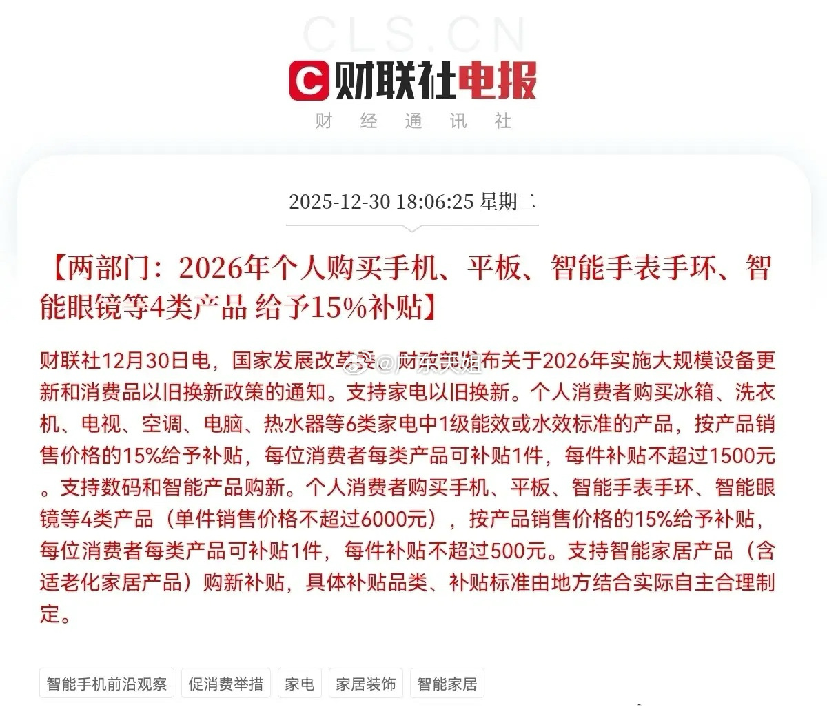 利好!大利好来了!两部门重磅发布消费电子迎来重大利好政策不出意外的话,明日消费电子要大爆发了,消费电子概念股要火力全开了晚间6点06分,国家发改委和财政部发布了2026年实施大规模设备更新和消费品以旧换新政策通知,其中强调2026年个人购买手机、平板、智能手表手环、智能眼镜等4类产品,给予15%补贴,2026年消费电子国补延续,这对于消费电子是大利好消息,15%的补贴力度将会直接刺激消费,提振消费市场信心,为消费电子行业注入确定性,尤其是智能眼镜作为2026年首次纳入的补贴产品,预计会带来爆发式增长,总之,补贴政策对消费电子板块的走势将提供显著的政策支撑和结构性催化,消费电子板块预计将呈现 震荡上行格局,在两部门利好政策下消费电子迎来黄金发展机遇,2026年相关领域的表现值得关注!股民们!坐稳扶好!受此利好消息刺激,预计明日消费电子板块要起飞了,尤其关注AI眼镜概念股要起飞!