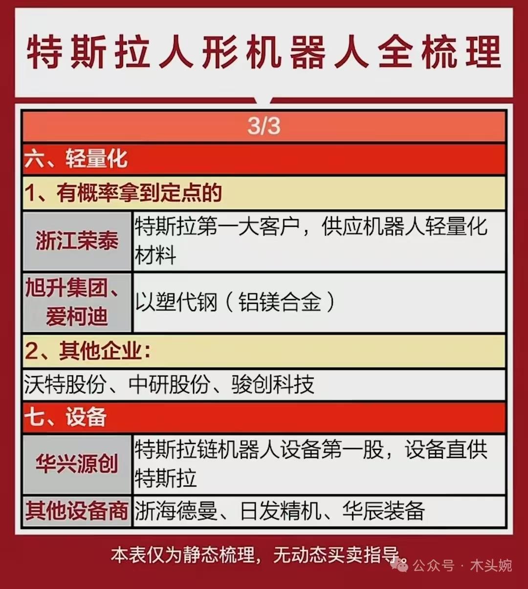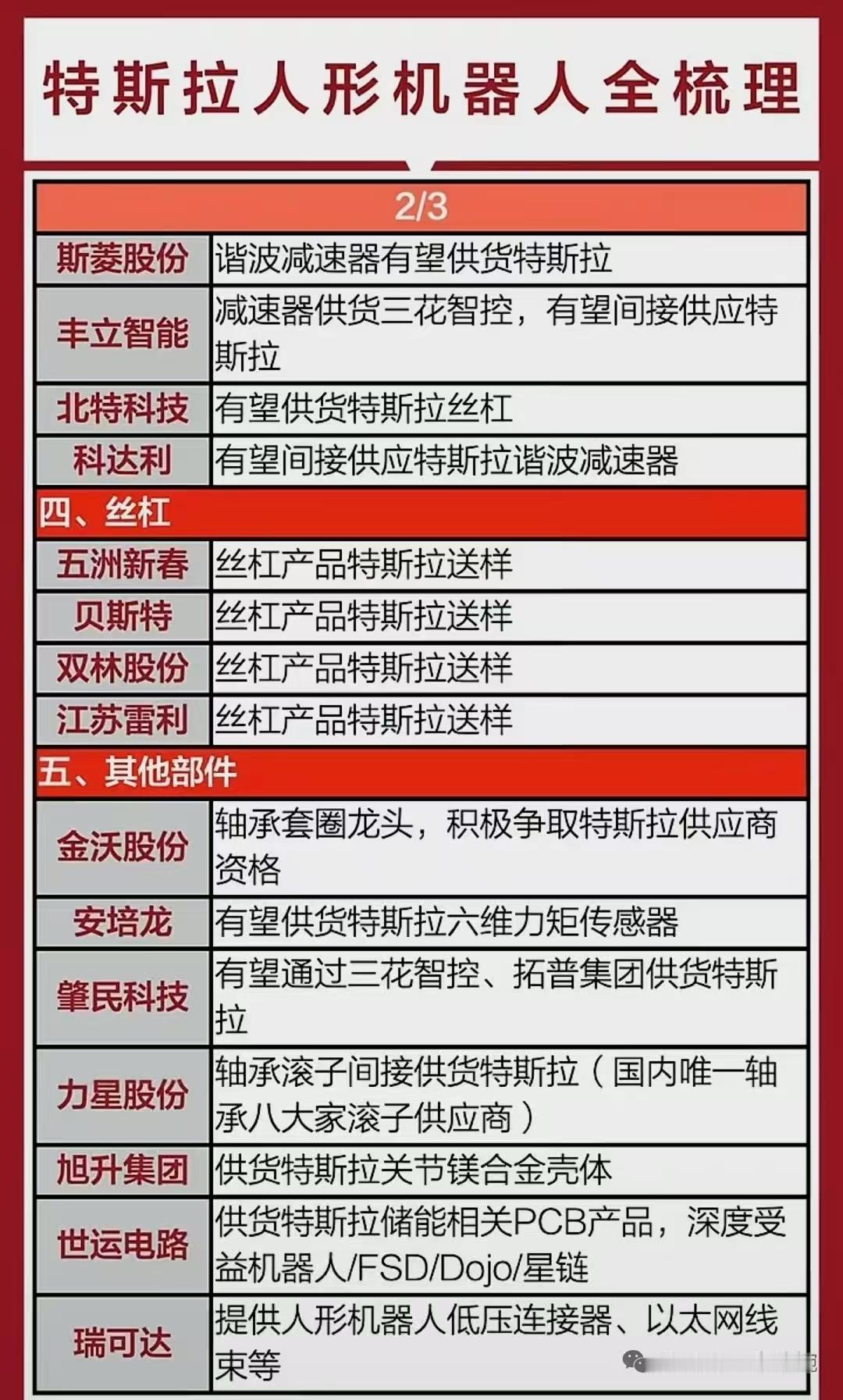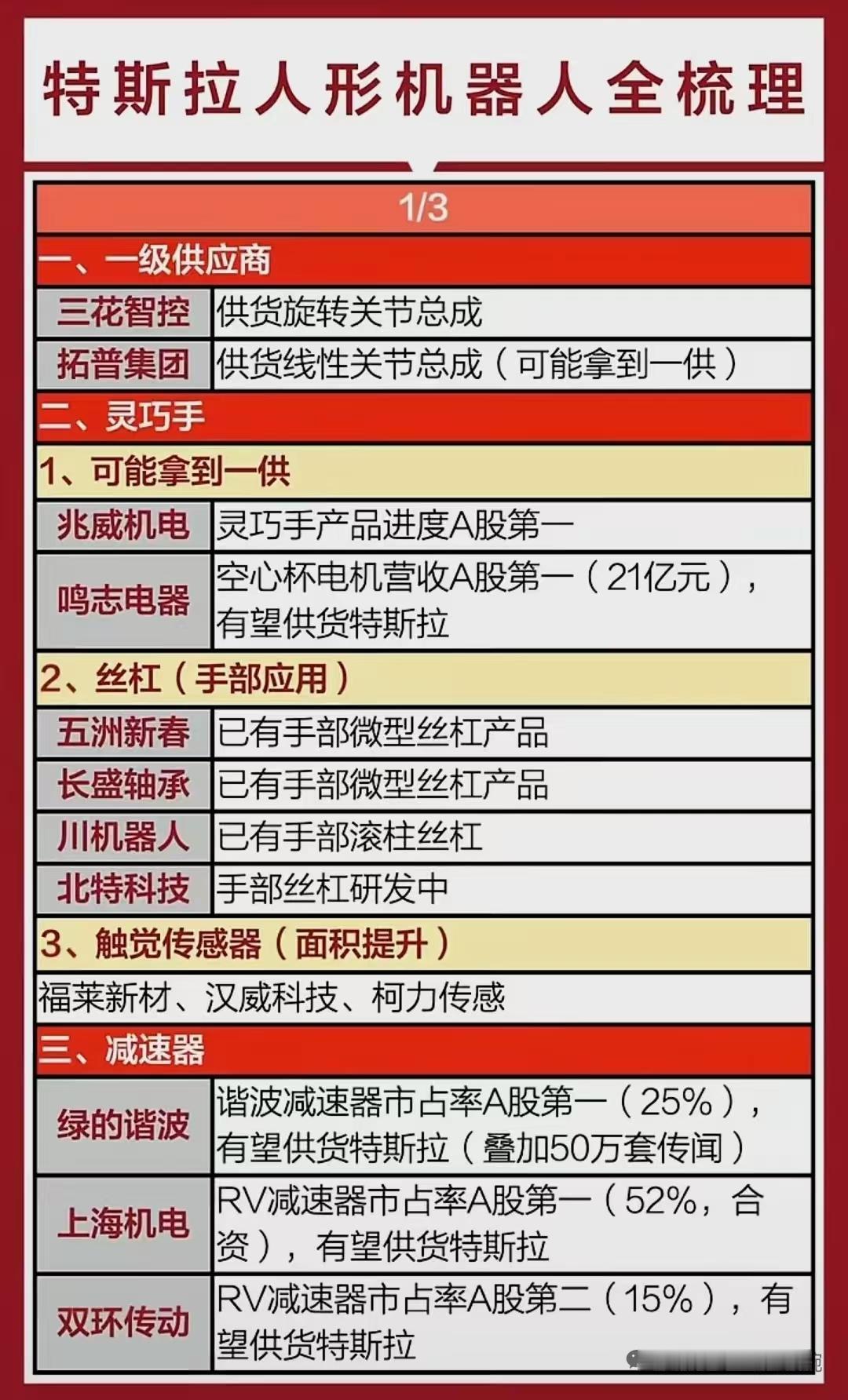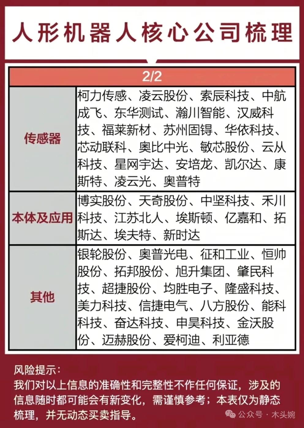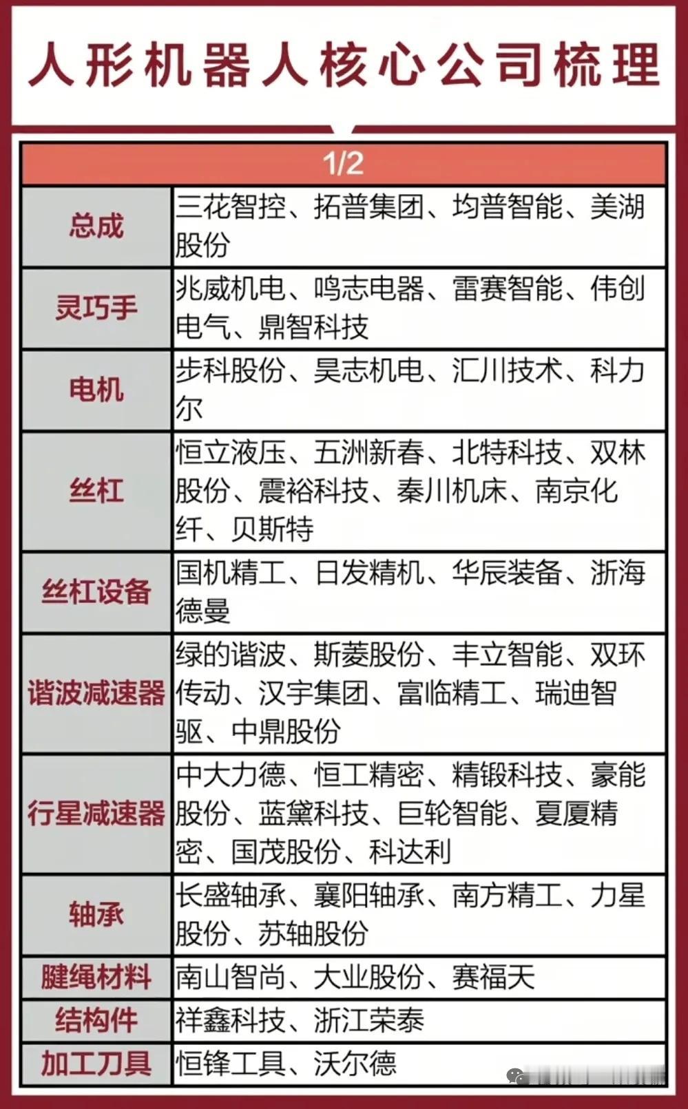 人形机器人概念利好来袭:12月26日,工信部人形机器人与具身智能标准化技术委员会成立;宇树科技全国首店12月31日北京京东MALL开业,加速C端落地;特斯拉Optimus项目发包预期升温,供应链企业密集对接。相关概念龙头企业有哪些? 2025年12月特斯拉审厂通过的中国企业有七家:三花智控(一级供应商)、拓普集团(关节供应商)、卧龙电驱(电机供应)、五洲新春(丝杆供应商)、长盈精密等等。 人形机器人赛道迎来政策、量产、技术多重利好,行业加速迈入标准化与规模化阶段。从总成、灵巧手、电机、减速器等核心零部件,到传感器、本体及应用环节,行业龙头代表名单见配图。 理财有风险入市需谨慎!