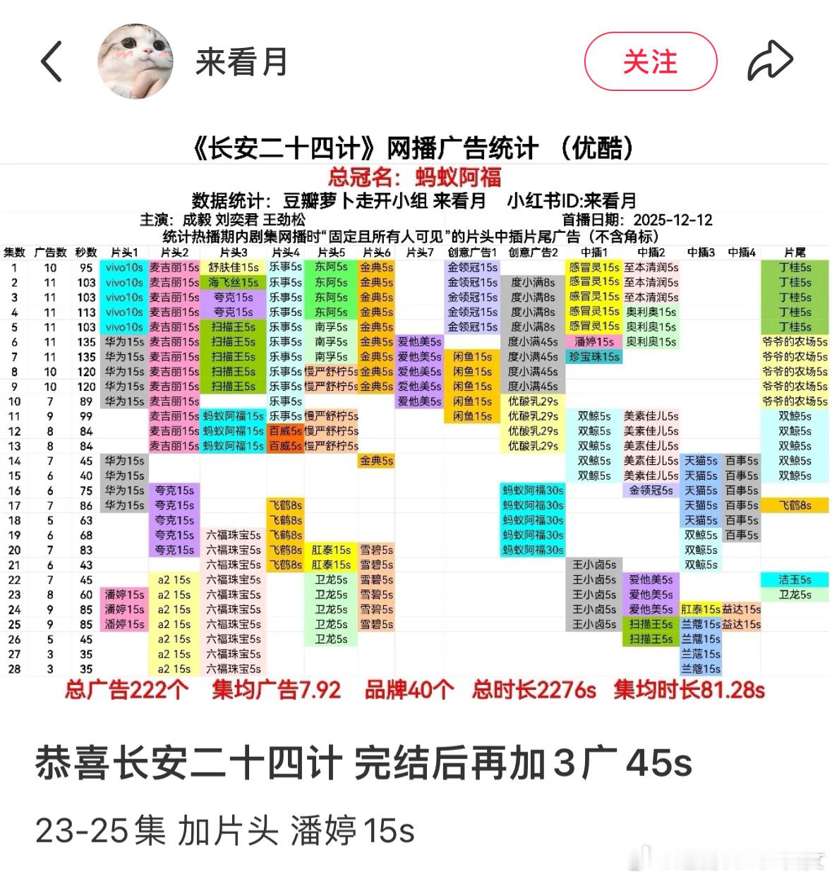 成毅长安二十四计超点后,又加广了,直接加广3集,播的好不好广最现,开播前特约赞助➕播期间加总冠名➕完结后再加广,广告横扫优酷1史冠5年冠的含金量还在刷新上升,长安二十四计今年黑马口碑爆剧,业内门清。