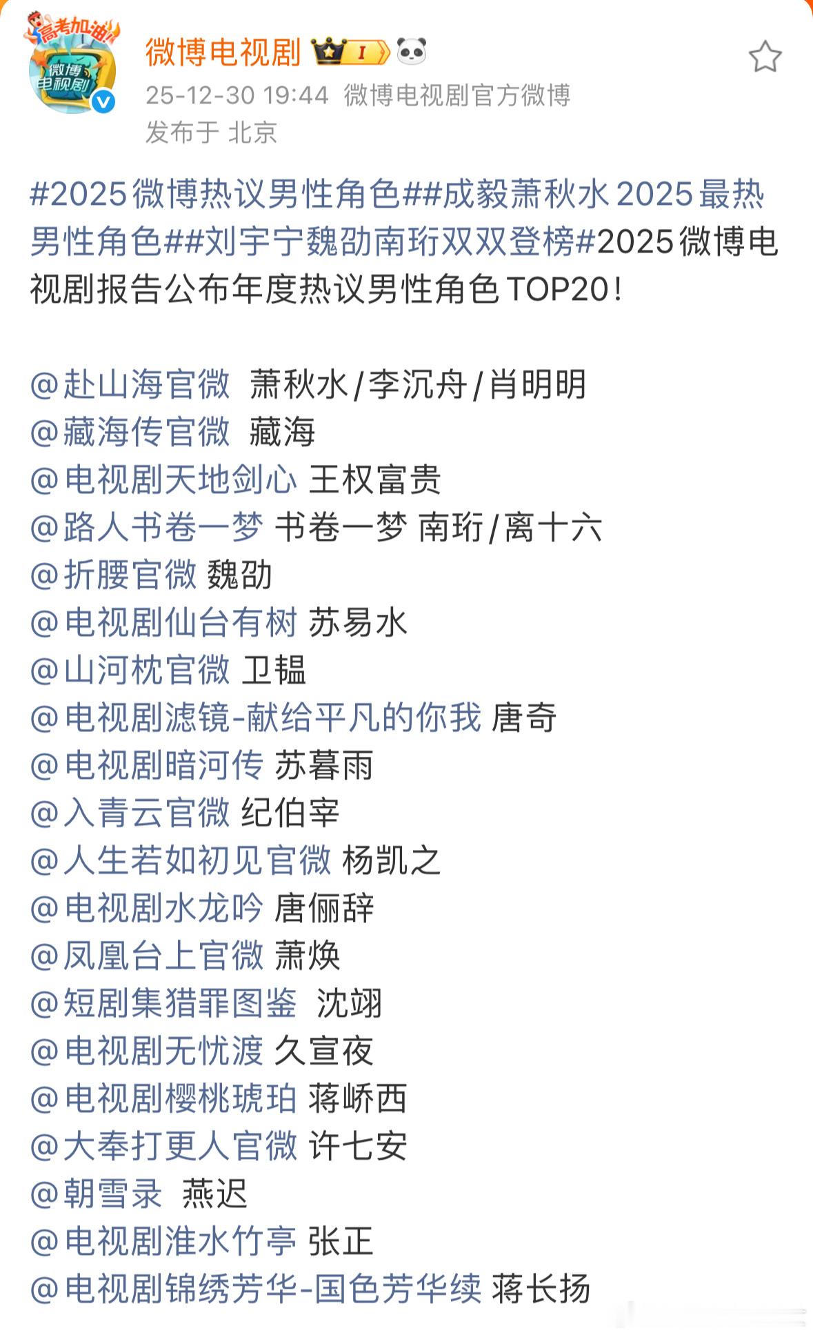 恭喜成毅赴山海萧秋水获得25年剧集热议男性角色年度第一,王权富贵第三,成毅还是太权威了,有效播剧,不靠热搜这是靠纯角色讨论度出圈的,还是太权威成毅携双角色杀进年度top3