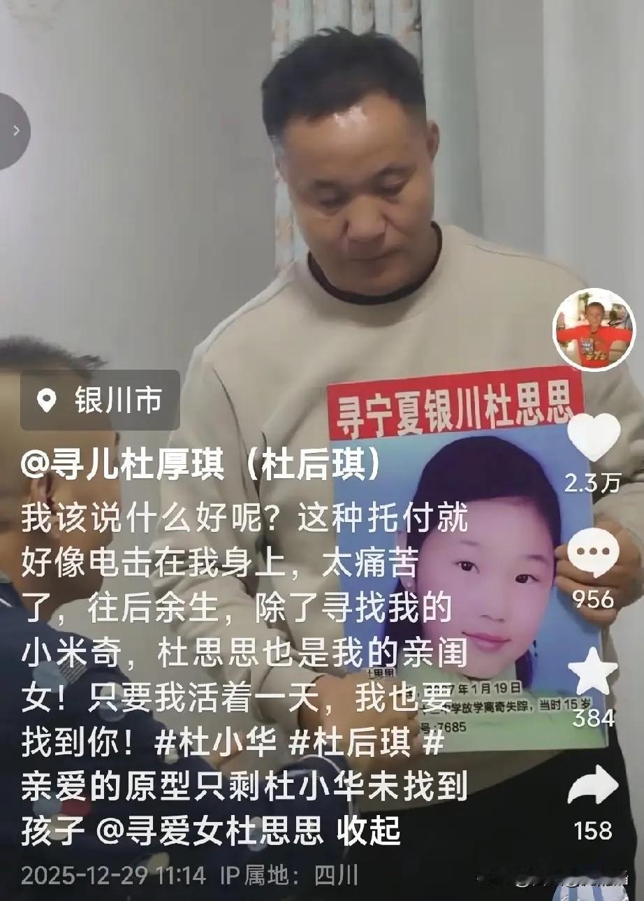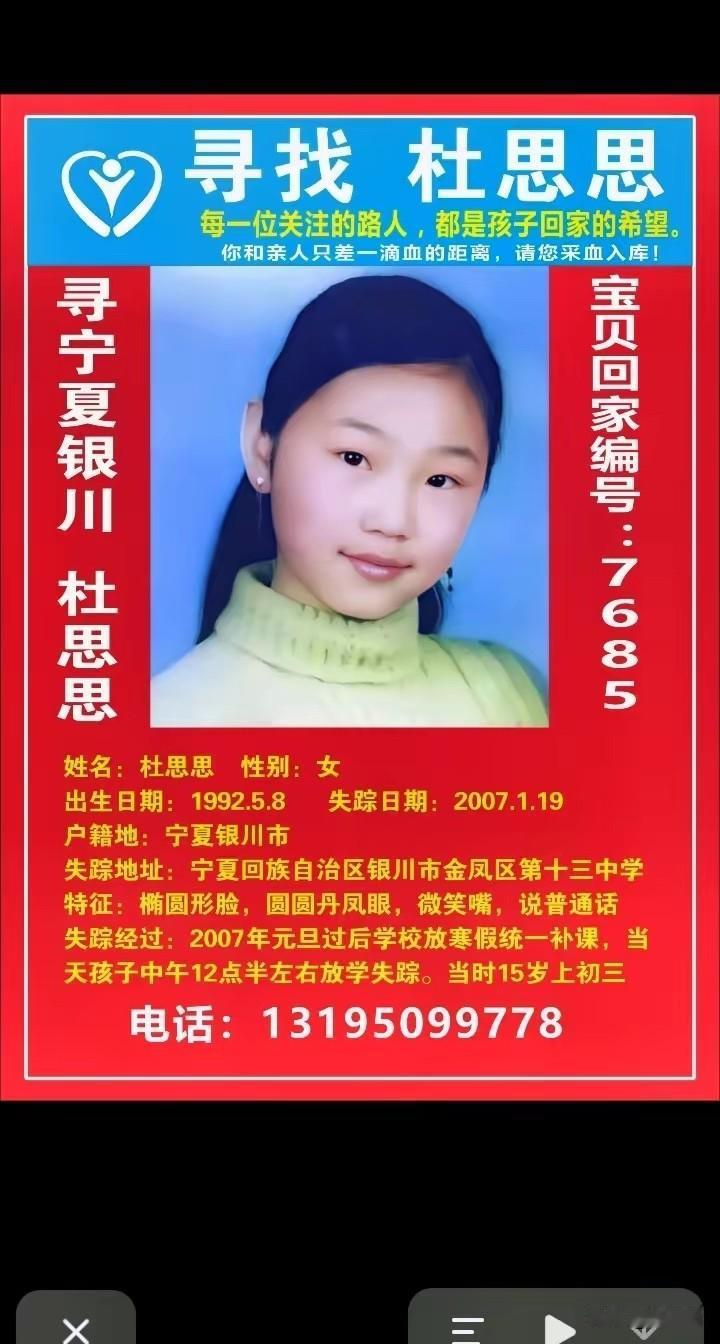 宁夏银川,杜金龙寻女18年未果,癌症晚期向寻亲好友杜小华托付:“这辈子我和女儿没缘分了,交给你了!” 杜思思,1992年5月8日出生,2007年1月19日在银川市金凤区第十三中学放学后失踪,时年15岁,身高约1.58米,穿蓝色运动鞋,椭圆脸、丹凤眼、爱笑,讲普通话。如今她已33岁。 思思在放学路上走失,再没消息,按理来说,15岁的年纪已懂得找回家的路,不知道思思在这回家的路遭遇了什么,不敢想象遇到了什么危险。 自2007年走失,已经18个年头,思思爸妈一天都没放弃过寻找。据杜小华透露,思思爸爸还是带着遗憾离开了,没有见到思思最后一面。 杜小华求助网友,并表示把思思当成亲闺女,往后余生,他的任务就是自己儿子小米奇和思思。 被寻亲团的互帮互助感动,也为走失儿童家庭的不易感到心酸,求求大家帮忙扩散转发,帮帮这些苦苦寻找孩子的家庭,帮助杜小华早日找到读思思和小米奇。
