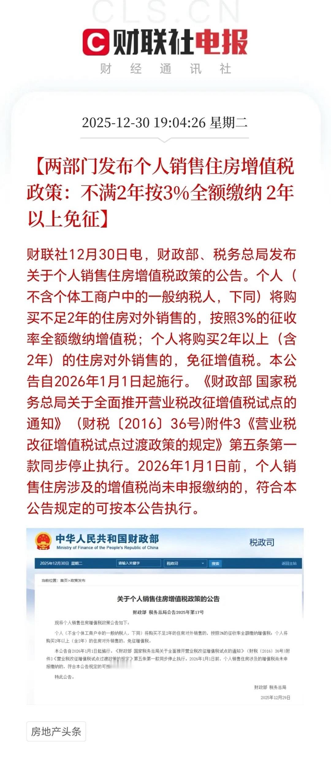 增值税房子又有重磅消息!从2026年1月1日起,个人售房增值税政策大调整。购买2年以上(含2年)住房对外销售,免征增值税;购买不足2年的,按3%征收率全额缴纳,之前可是5%。以100万房子为例,以前卖不满2年的房子要交5万增值税,现在只需3万,能省2万。这政策能降低房屋出售环节税费成本,减轻房东负担,促进房屋交易,对房地产去库存有好处。而且,2026年1月1日前未申报缴纳的,也能享受降免政策,很人性化。准备买房卖房的可得重点关注!