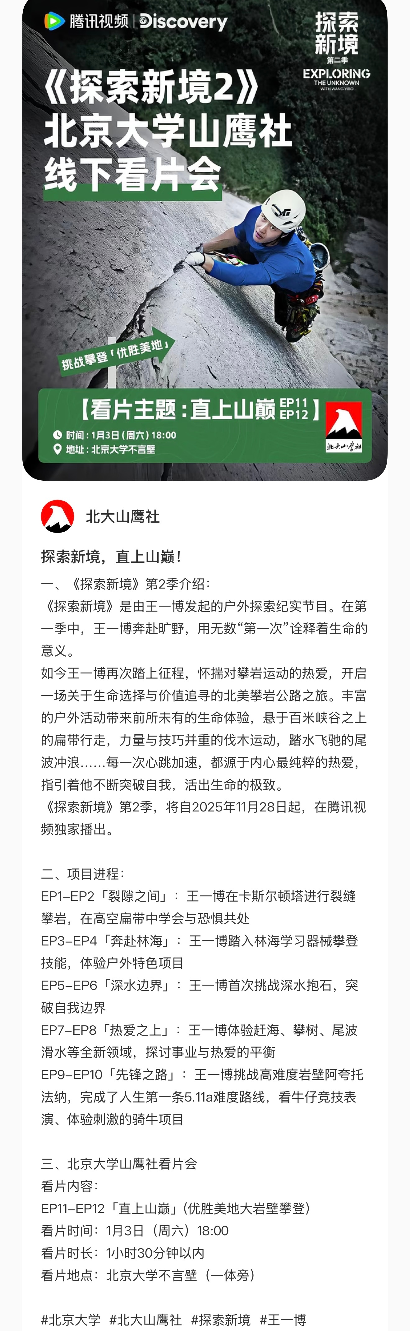 王一博 探索新境2进北大看片了!观看最新的EP11-EP12「直上山巅」(优胜美地大岩壁攀登)~牛哇王一博,就这样热爱做到极致