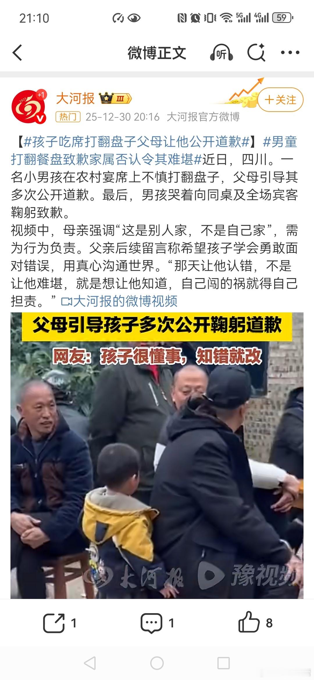 【孩子吃席打翻盘子父母让他公开道歉】男童打翻餐盘致歉家属否认令其难堪父母教给孩子,什么是规则,什么是规矩,赞成这个父母,就是要从小学会说谢谢和对不起,不怕犯错,勇敢承担,没什么大不了的,有责任有担当。 坦白讲,这句话写得很差:“亲爱的儿子:希望你十年二十年后还能看到这个视频”。希望以后不要发生不该发生的事! 很多熊孩子调皮捣蛋的时候,旁人气的不是孩子,而是明明站在一旁,却像死硬了一样不闻不问的父母。 在外人面前要讲礼节,在家里才讲教育,这妈妈没有错啊,如果在先教育孩子而不是先道歉,人家只会觉得你在家里没教好。 其实没必要这么玻璃心吧!7080后的孩子,哪个不是被父母打骂长大的,我们现在反而更坚强。也从来没有记恨过父母,相反觉得父母养大我们不容易,再看看现在的一些孩子,不能说,不能骂,更不能打,天天提倡要爱的教育,他们反而很脆弱。一点点抗压能力都没有了