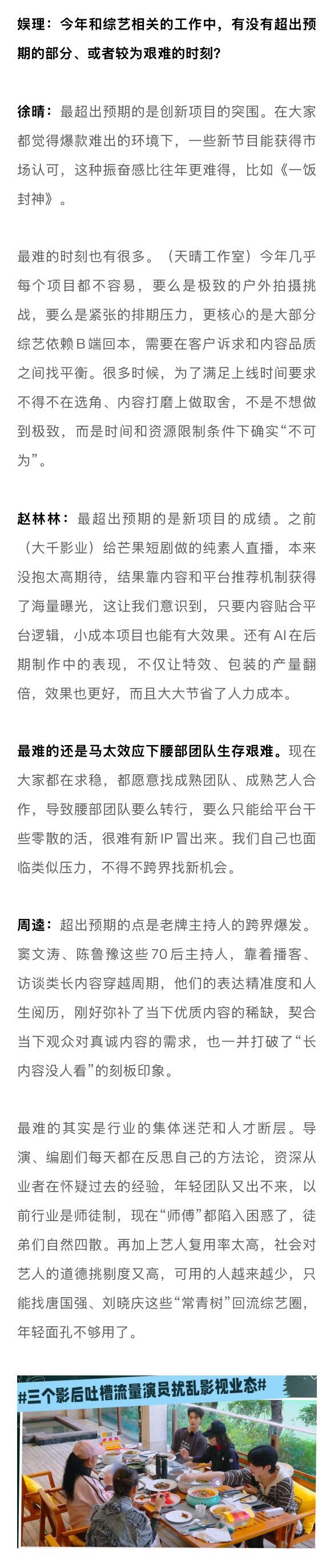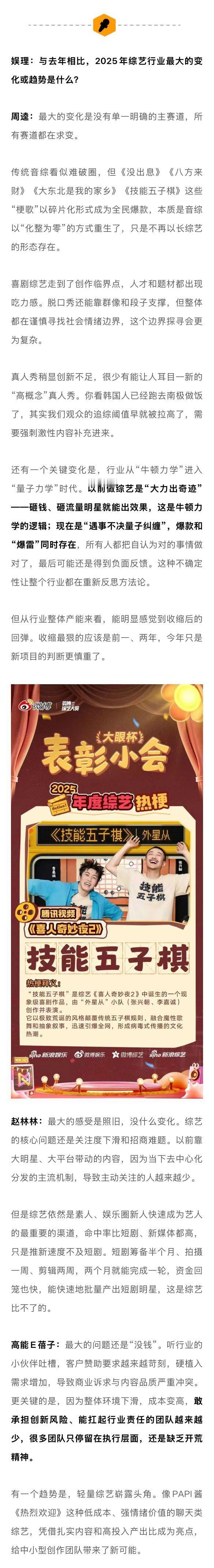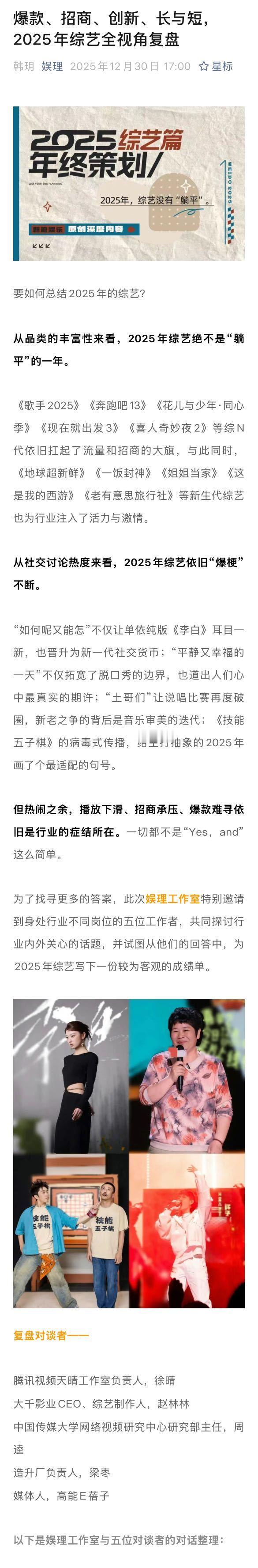 业内谈唐国强刘晓庆回流综艺2025综艺没有躺平 从品类的丰富性来看,2025年综艺绝不是“躺平”的一年。《歌手2025》《奔跑吧13》《花儿与少年·同心季》《现在就出发3》《喜人奇妙夜2》等综N代依旧扛起了流量和招商的大旗,与此同时,《地球超新鲜》《一饭封神》《姐姐当家》《这是我的西游》《老有意思旅行社》等新生代综艺也为行业注入了活力与激情。从社交讨论热度来看,2025年综艺依旧“爆梗”不断。“如何呢又能怎”不仅让单依纯版《李白》耳目一新,也晋升为新一代社交货币;“平静又幸福的一天”不仅拓宽了脱口秀的边界,也道出人们心中最真实的期许;“土哥们”让说唱比赛再度破圈,新老之争的背后是音乐审美的迭代;《技能五子棋》的病毒式传播,给主打抽象的2025年画了个最适配的句号。但热闹之余,播放下滑、招商承压、爆款难寻依旧是行业的症结所在。为寻找更多答案,新浪娱乐工作室邀请到了腾讯视频天晴工作室负责人徐晴,大千影业CEO、综艺制作人赵林林,中国传媒大学网络视频研究中心研究部主任周逵,造升厂负责人梁枣和媒体人,共同探讨行业内外关心的话题,为2025年综艺写下一份较为客观的成绩单。娱理独家↓