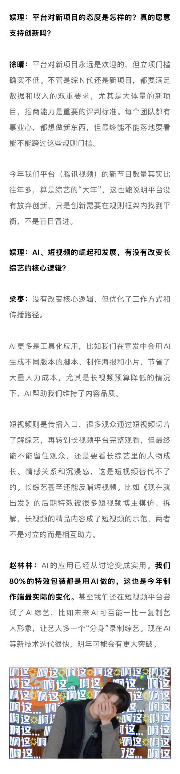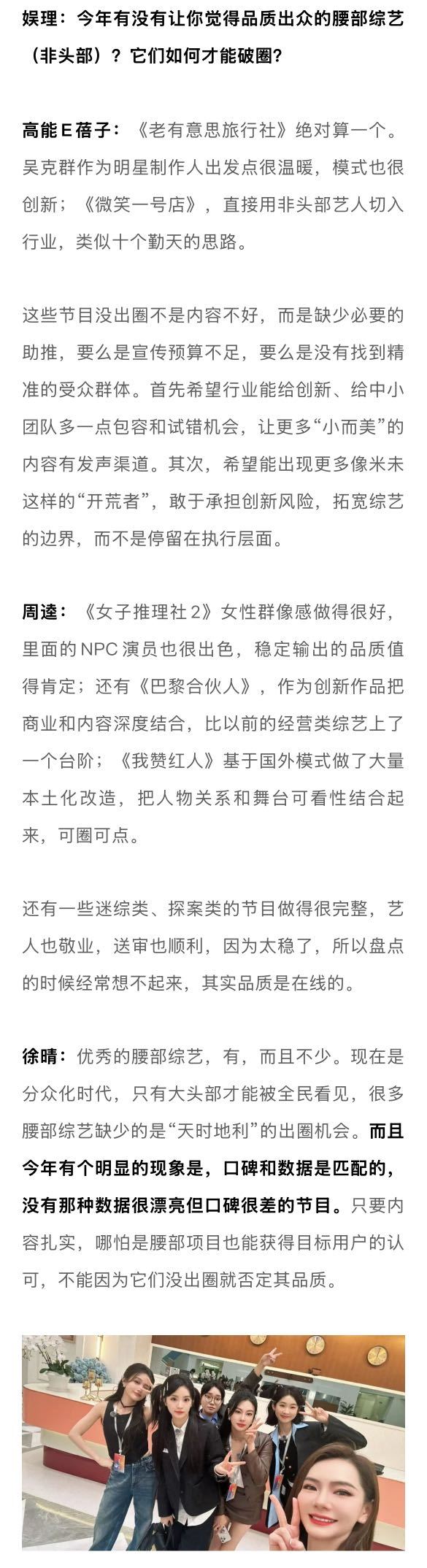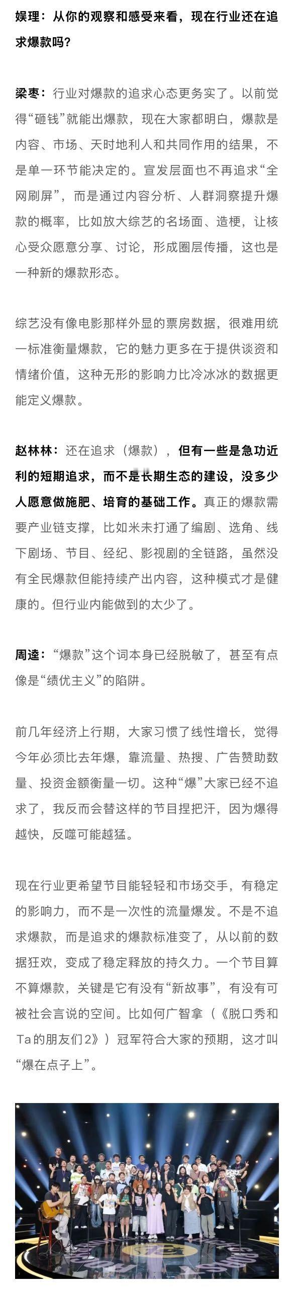 业内谈唐国强刘晓庆回流综艺2025综艺没有躺平 从品类的丰富性来看,2025年综艺绝不是“躺平”的一年。《歌手2025》《奔跑吧13》《花儿与少年·同心季》《现在就出发3》《喜人奇妙夜2》等综N代依旧扛起了流量和招商的大旗,与此同时,《地球超新鲜》《一饭封神》《姐姐当家》《这是我的西游》《老有意思旅行社》等新生代综艺也为行业注入了活力与激情。从社交讨论热度来看,2025年综艺依旧“爆梗”不断。“如何呢又能怎”不仅让单依纯版《李白》耳目一新,也晋升为新一代社交货币;“平静又幸福的一天”不仅拓宽了脱口秀的边界,也道出人们心中最真实的期许;“土哥们”让说唱比赛再度破圈,新老之争的背后是音乐审美的迭代;《技能五子棋》的病毒式传播,给主打抽象的2025年画了个最适配的句号。但热闹之余,播放下滑、招商承压、爆款难寻依旧是行业的症结所在。为寻找更多答案,新浪娱乐工作室邀请到了腾讯视频天晴工作室负责人徐晴,大千影业CEO、综艺制作人赵林林,中国传媒大学网络视频研究中心研究部主任周逵,造升厂负责人梁枣和媒体人,共同探讨行业内外关心的话题,为2025年综艺写下一份较为客观的成绩单。娱理独家↓