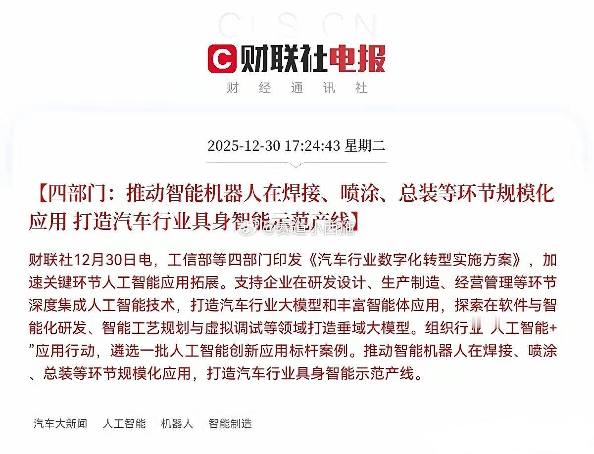 四部门放大招!汽车产线成具身智能机器人“练兵场”,明日主升浪稳了?12月30日17:24,工信部等四部门联合印发《汽车行业数字化转型实施方案》,明确推动智能机器人在焊接、喷涂、总装等核心环节规模化应用,打造汽车行业具身智能示范产线。这记政策“猛料”,对本就火热的机器人板块堪称“火上浇油+空中加油”,满仓布局的投资者或迎来跨年盛宴!一、政策为何是“真利好”?三个核心逻辑1. 最大应用场景全面激活:汽车制造是工业机器人最大下游,单条产线焊接、喷涂、总装等环节对高精度、高柔性机器人需求迫切。政策推动规模化应用,直接为具身智能技术提供千亿级落地场景,解决“技术落地难”的核心痛点。2. 从“自动化”到“具身智能”的质变:示范产线要求机器人具备“感知-决策-执行”全链条能力,不再是简单重复劳动。这将倒逼核心部件(伺服、控制器、视觉传感器)与算法迭代,加速国产替代与高端化突破。3. 可复制的产业加速器:汽车产线的技术验证成功后,解决方案与商业模式可快速复制到航空航天、高端装备、电子制造等领域,打开机器人产业“黄金十年”成长空间。二、板块情绪与资金信号:热度已拉满今日机器人板块已率先走强,晚间政策落地进一步点燃市场情绪。结合12.30暗盘隔夜挂单数据,机器人概念独占三席:三花智控(挂单56.49亿)、万象前朝(31.76亿)、泰尔股份(1.62亿),合计近90亿资金抢筹,资金认可度与进攻意愿拉满,明日板块主升浪预期强烈。三、核心标的与机会方向(聚焦主业纯粹、技术硬核)1. 核心部件(高壁垒,业绩确定性强)- 三花智控:机器人热管理+关节总成龙头,汽车与机器人双赛道共振,挂单金额断层领先,跨年人气核心。- 汇川技术:伺服系统与控制器市占率领先,汽车焊接、搬运机器人核心供应商,2025年相关业务增长超40%。- 卧龙电驱:机器人伺服电机核心企业,覆盖汽车制造机器人全系列,国产替代空间广阔。2. 本体与产线集成(直接受益规模化落地)- 埃斯顿:国产焊接机器人龙头,汽车厂核心供应商,订单弹性大。- 新时达:聚焦汽车总装环节协作机器人,适配“多品种、小批量”柔性生产需求。3. 具身智能算法与场景(技术驱动,弹性大)- 科大讯飞:汽车垂域大模型+智能体应用,赋能产线智能决策。- 海格通信:机器人飞控/通信系统核心,支撑产线协同与数据传输。四、操作提醒与风险提示- 聚焦主线:优先选择主业聚焦机器人核心环节、技术壁垒高的标的,警惕业务占比低的“蹭热点”公司。- 节奏把控:板块情绪高涨,可关注核心标的开盘强度,但需防范追高风险,优先低吸业绩兑现确定性强的细分龙头。- 长期逻辑:产业链自主可控与具身智能技术迭代是核心,短期情绪炒作后,业绩兑现能力将成为股价持续上涨的关键。以上内容基于公开信息整理,不构成投资建议。股市有风险,入市需谨慎。