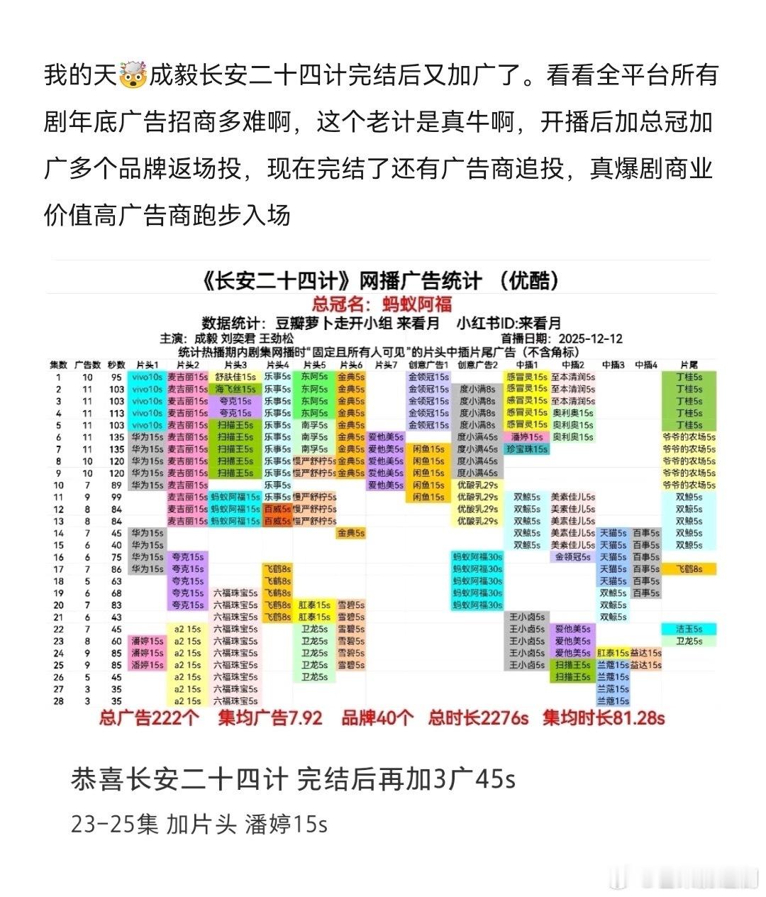 成毅长安二十四计又加广了事实证明,真正的大爆剧财神爷就算完结了品牌都追着你投广,中国移动和联通两大运营商都开始打擂台抢人了。经济下行资金紧张年底招商更难,全平台一大堆剧集无广,而成毅的剧做到播前招商爆满播后空降总冠超点完结又加广,扛剧扛招商扛热度商业价值天花板!