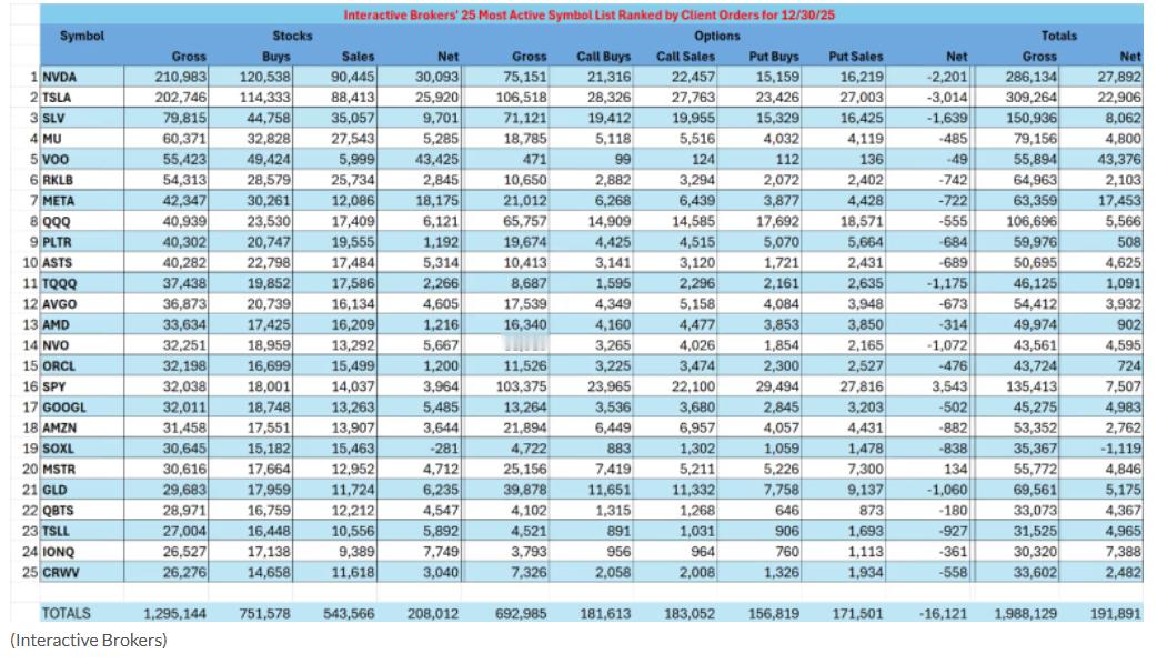 盈透证券首席策略师史蒂夫·索斯尼克表示,盈透平台上的散户倾向于追逐波动性。因此,在近期白银呈抛物线式上涨期间,交易者大量涌入白银ETF,作为短线操作的工具。白银 在盈透证券的热门交易代码榜单中,iShares白银信托ETF(SLV)排名第三,超过了Palantir、Meta Platforms和Invesco QQQ信托ETF等热门股票。“我不记得之前在榜单上见过SLV,但本周超越了一些长期受欢迎的标的。”索斯尼克在一份报告中写道。“尽管SLV的交易活动偏向买入,但看起来更多是被当作交易工具,而非纯粹的投资标的。”(市场观察)为海外华人提供有价值的信息与分析,更多内容和全文可在蓝天、电报、x查找causmoney,或直接谷歌搜索caus.com