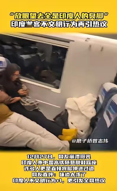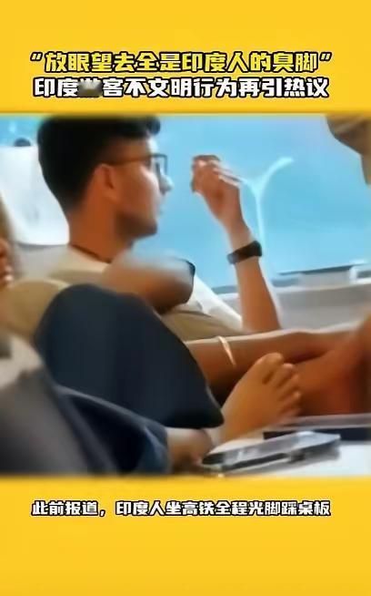 “滚回自己的国家!”12月27日,四川,一男子刚上高铁,就看见一群印度人在车上脱下了鞋,光脚踩在座椅上,甚至有不少人直接躺下将脚伸到过道,不仅影响乘客通行,脚臭味更是弥漫整个车厢,熏得周围乘客纷纷捂鼻。网友:隔着屏幕都有味! 男子实在忍不了,当场就吼了出来。这话一落,车厢里瞬间安静了,好几双眼睛齐刷刷看向这边。那群印度人里有人面露尴尬,赶紧把脚收了回去,还有人一脸不解,叽里咕噜说着旁人听不懂的话。 旁边有乘客跟着附和,说公共场所就得守规矩,脱鞋踩座太没素质。也有人悄悄拉了拉男子的衣角,劝他别太激动,免得闹出更大的矛盾。双方的脸色都不太好看,气氛一下子紧张起来。 乘务员很快赶了过来,先安抚了大家的情绪,又用英语跟那群印度人沟通。原来他们不清楚高铁上的规定,还以为跟自家火车一样随便。乘务员耐心讲解,对方连连点头道歉,还主动把鞋子穿好,收拾干净了脚下的位置。 男子看着这一幕,心里的火气慢慢消了。他掏出手机拍了张照片,不是为了吐槽,而是想提醒出门在外的人,尊重规矩就是尊重他人。 各位读者你们怎么看?欢迎在评论区讨论。