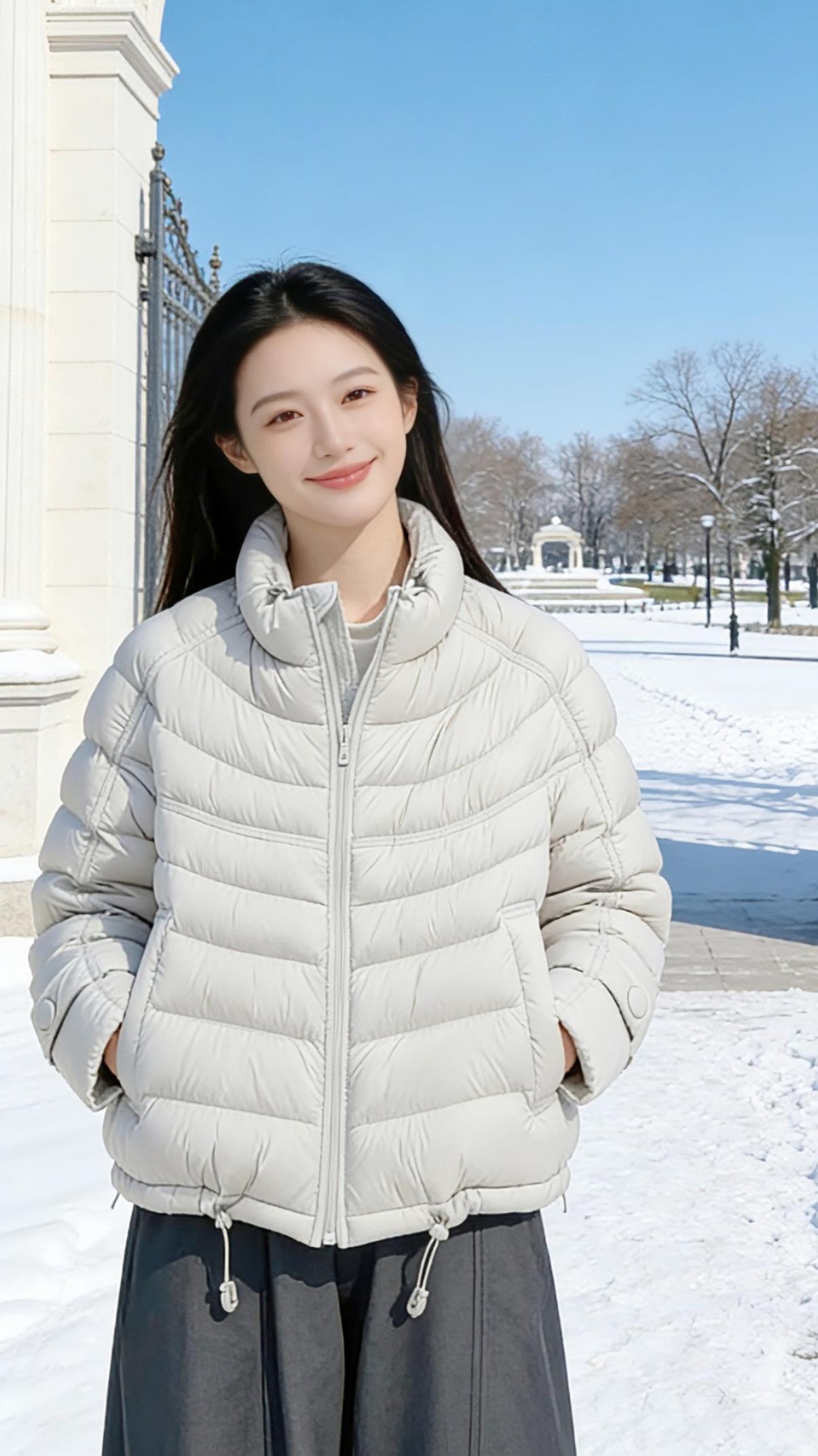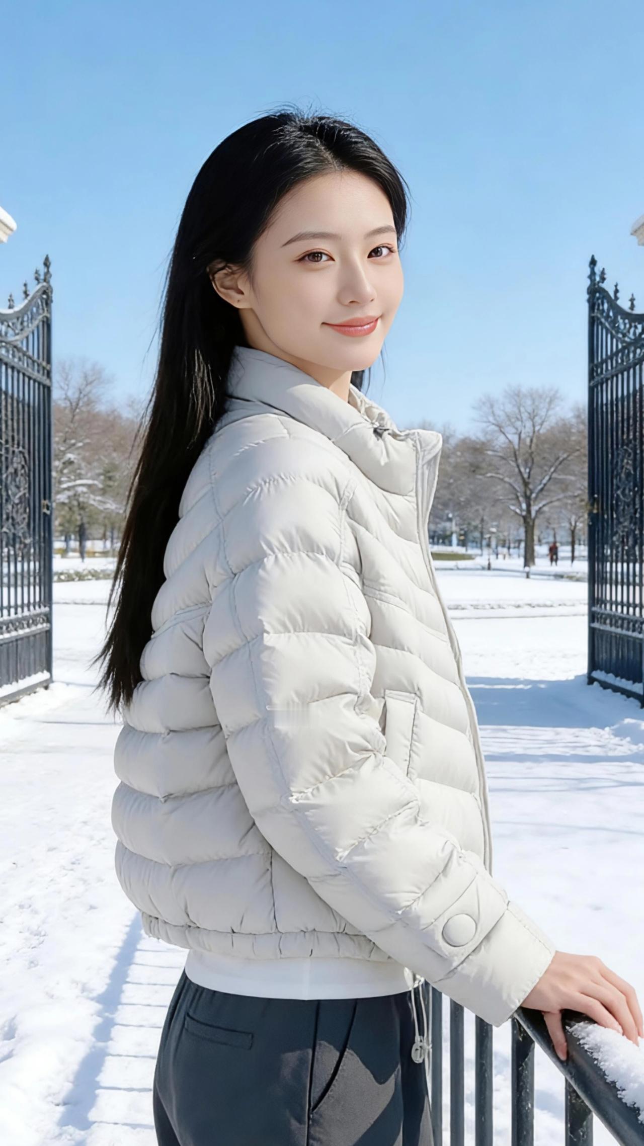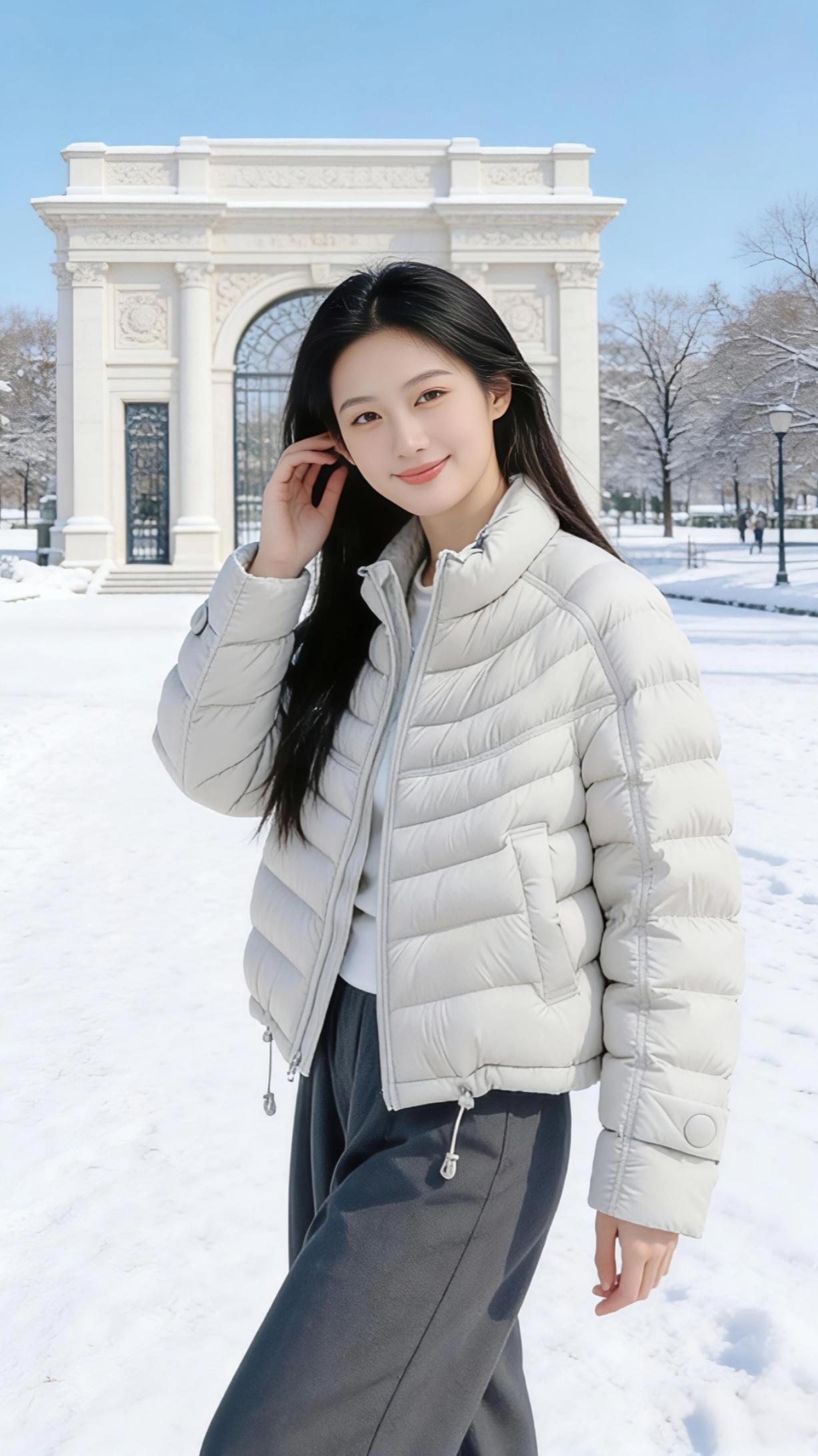 雪日游园 冬日的风裹着碎雪,掠过公园雕花的铁栏,澄澈的蓝天像一块刚熨烫过的蓝绸,铺展在头顶。她立在雪色里,浅灰色的羽绒服蓬松柔软,像裹了一团温温的云,与遍地的白相映,又被深灰的裤装衬出几分利落。 指尖轻触栏杆上的薄雪,凉意倏忽漫上指尖,却不及眼底的笑意温热。她侧过身,长发如墨瀑垂落,发梢沾了细碎的雪粒,像缀了星子。回身时,手插在衣兜,雪地映着她的笑,比阳光还明媚几分;抬手拢发的瞬间,风雪似也温柔了,只绕着她的身影轻轻旋。 行至拱门处,她将双手摊开向天地,仿佛要拥住这整一个雪日的清欢。雪落在肩头,融在眉弯,而她的笑,是这凛冬里最鲜活的春色。园中的雪还在静静落,时光也慢下来,只余下蓝天、白雪,和她眉眼间漾开的温柔,成了冬日里最动人的一幅画高级感穿搭 小个子穿搭 冬季穿搭 过年穿什么