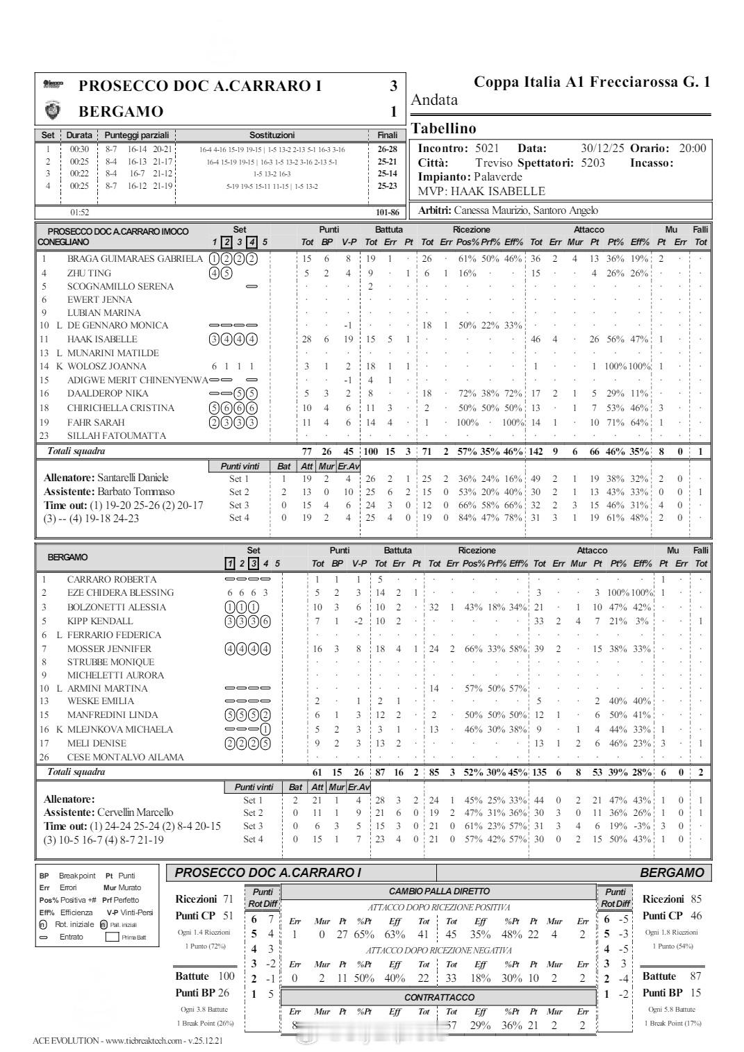 【女排意大利杯科内3-1贝尔加莫进四强 MVP哈克28分朱婷2局5分】中国排球留洋动态国际排坛战报速递 12月30日特雷维索,女排意大利杯1/4决赛,科内利亚诺3-1(26-28/25-21/25-14/25-23)击败贝尔加莫,晋级四强,半决赛将对阵诺瓦拉。MVP哈克28分、加比15分、法尔11分、奇里切拉10分、朱婷前两局出战得到5分(15扣4中1发),莫瑟尔16分、波佐內蒂10分。