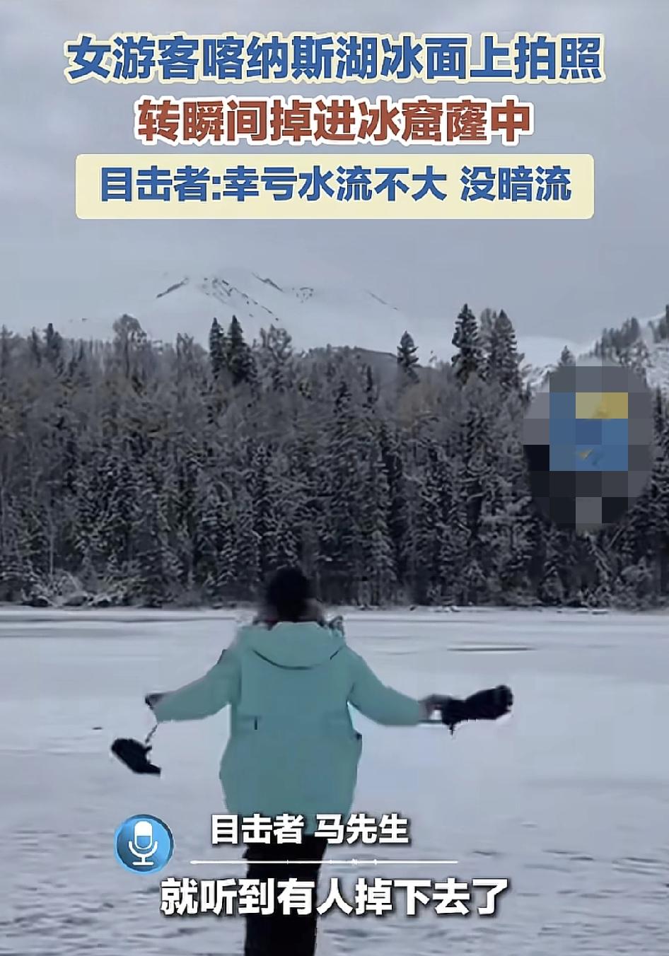 阿勒泰一位女游客在喀纳斯冰湖面上拍照,一下子想跳下去,结果就趴在湖面上了,附近有人听到有人在喊,赶紧去帮忙拉上来,周边的群众说,幸亏是下面水流不大,没有什么暗流,不然真的很危险。不管是当地的游客还是外地的游客,在这种冰湖面上玩耍都是不安全的,但是很多人为了拍照好看,都会冒险去试一下。