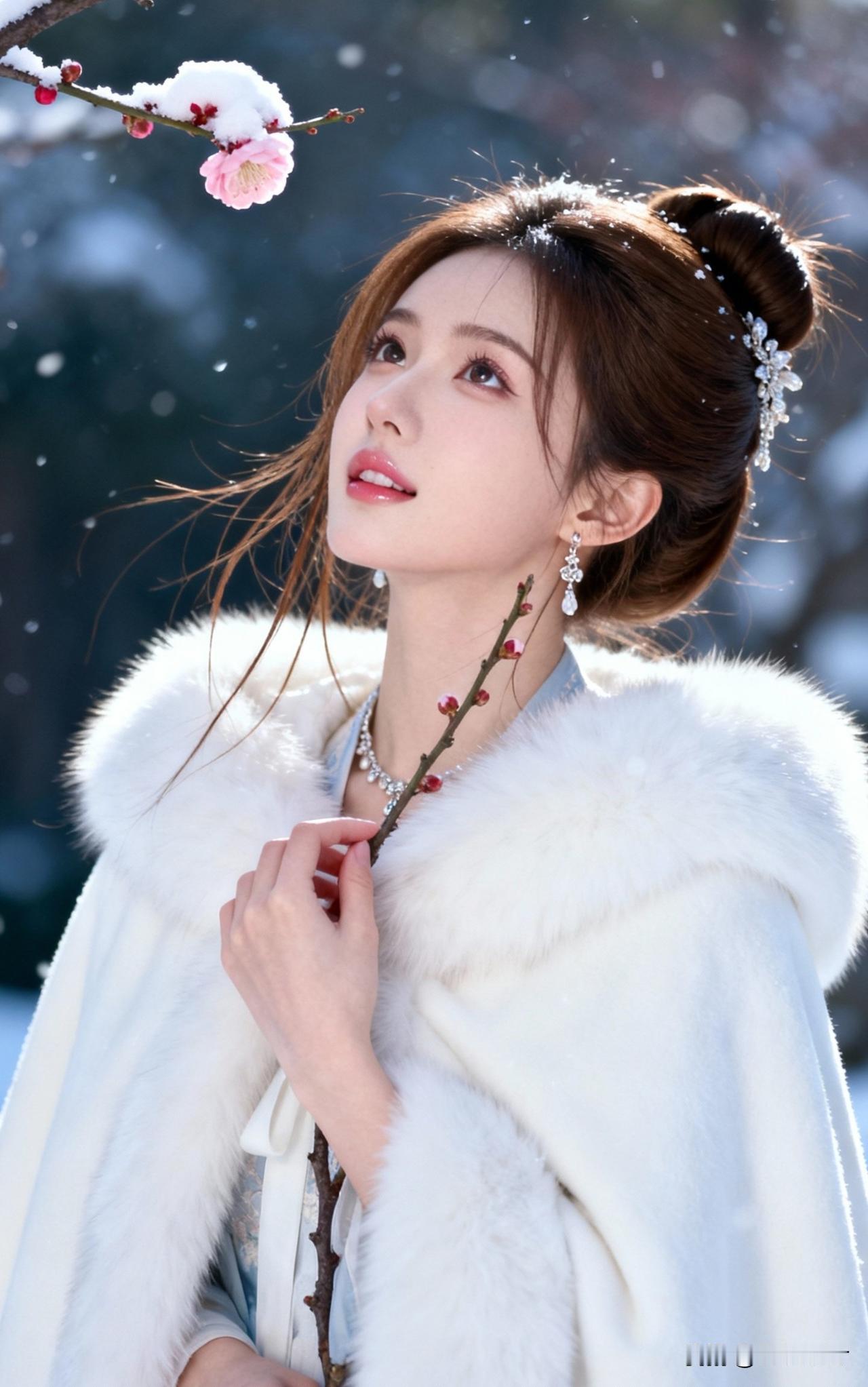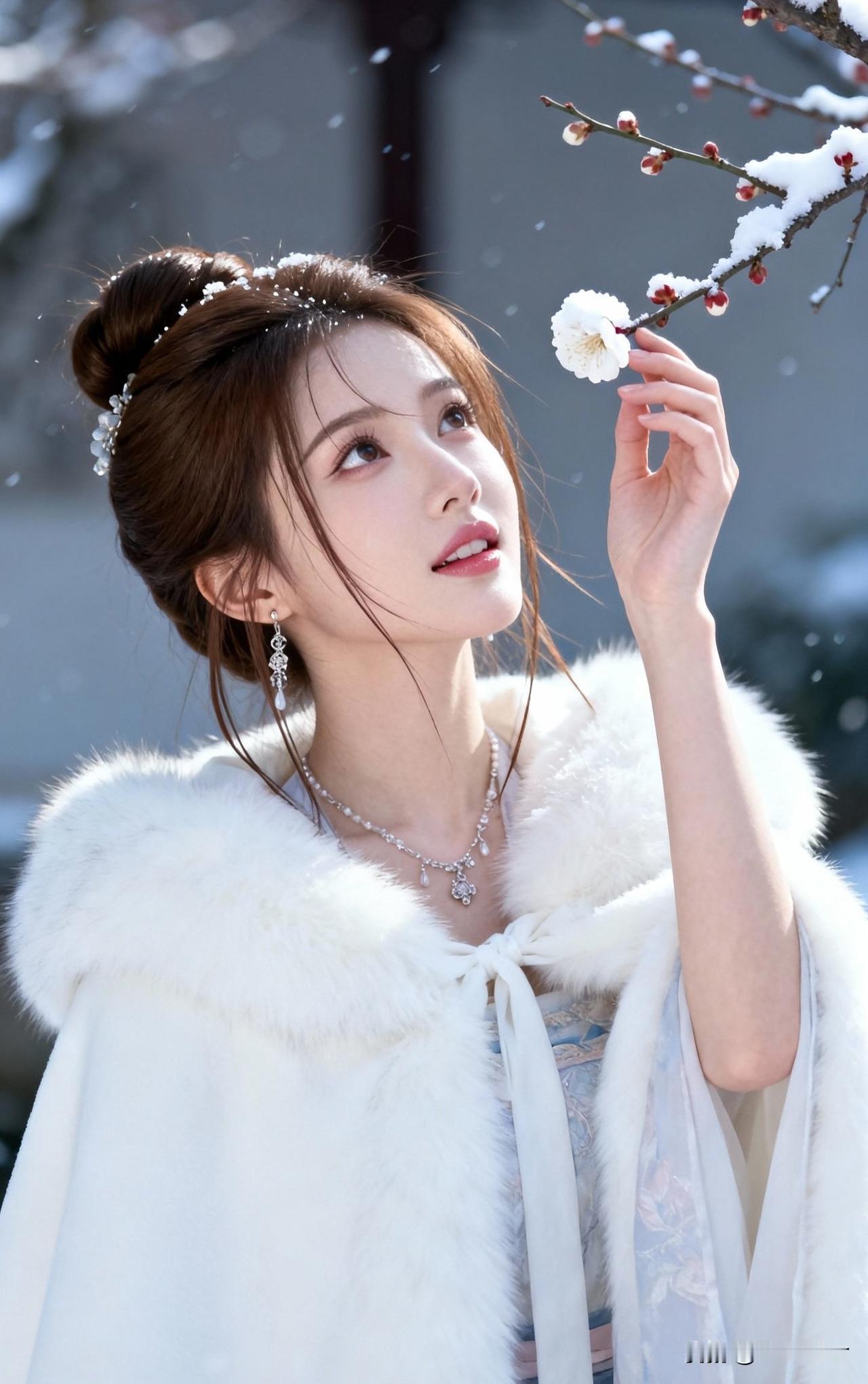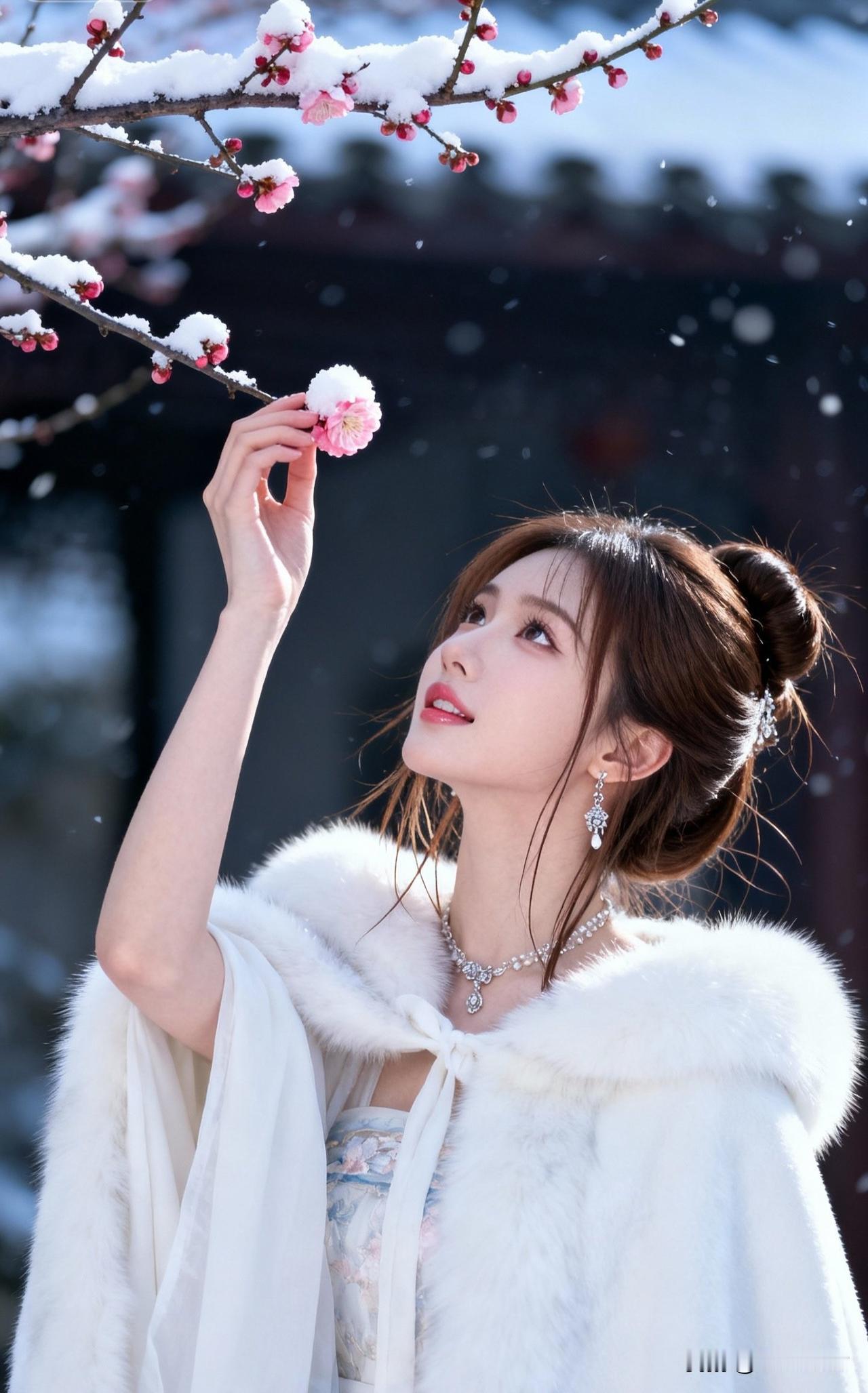 冬日雪景中的优雅女子,轻抚盛开的梅花,宛如仙子降临。