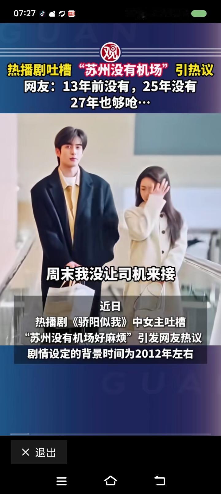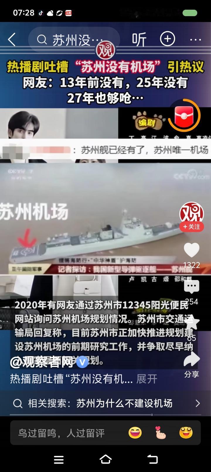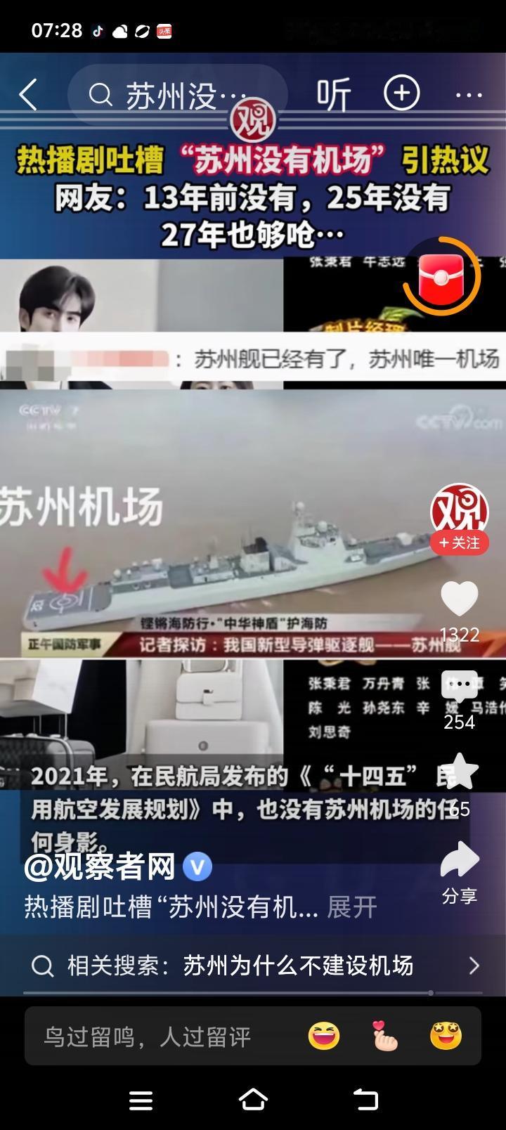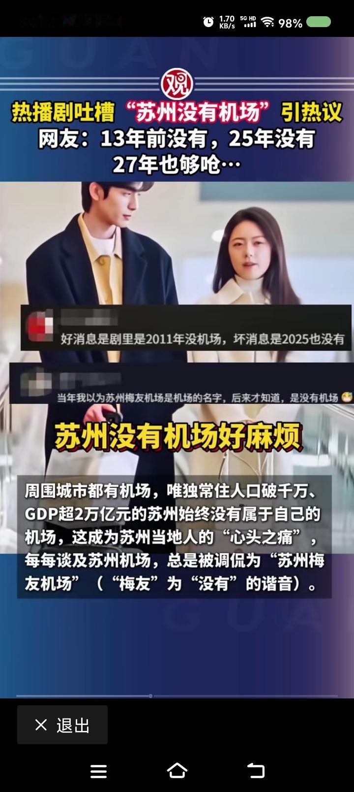 苏州为什么要有机场?—— 据报道,一句台词又让苏州“火”了。剧中人物说:“苏州没有机场,好麻烦。”苏州人多,发达,却没有机场,成为很多人的痛。 点评: 这点痛,怕什么? 有没有机场,主要看位置。苏州周围,有机场吧? 建机场,不是建停车场。那得占多少耕地?我心疼。