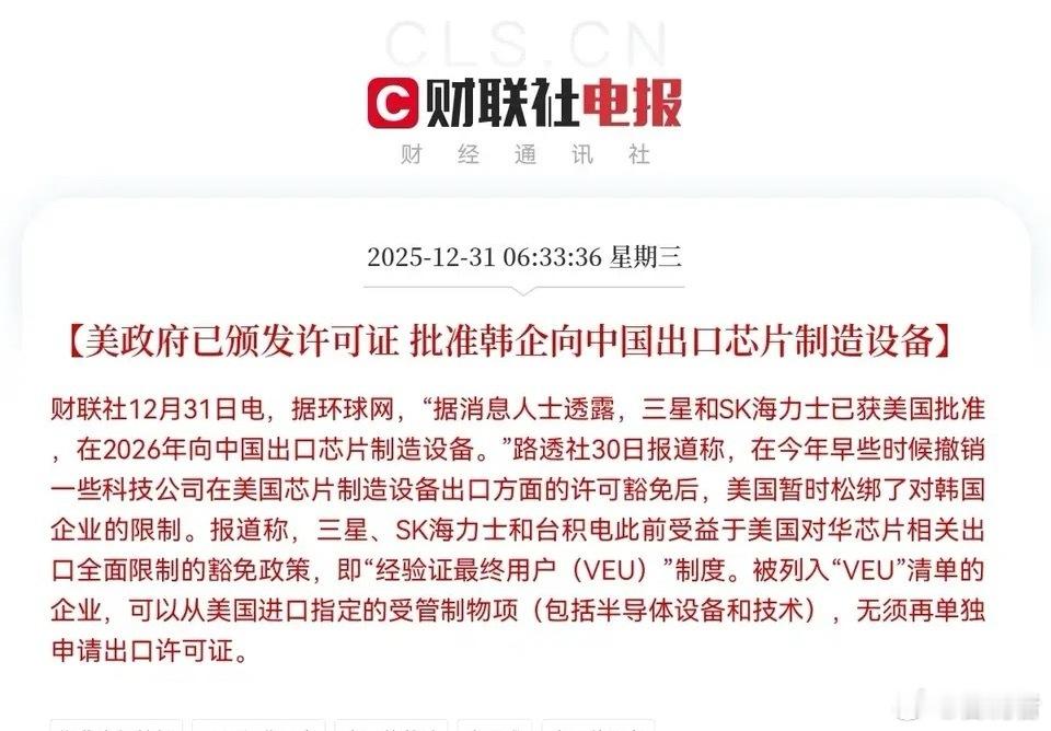 重大利好消息!半导体芯片继续起飞!一一觉醒来,利好消息迎面而来,满仓半导体芯片的小伙伴们,此刻估计都激动的从床上跳起来了早上6点33分,据外媒环球网报道,三星和SK海力士已经获得美国批准,在2026年向中国出口芯片制造设备,这个消息对于半导体芯片产业又是一枚重磅利好消息,美国这次好像真的改变策略了,开始不卡脖子了,这对于全球半导体芯片产业链的稳定至关重要,三星和SK海力士是全球存储芯片的两大巨头,其中国工厂获得设备许可,这不仅有利于两大公司的业绩,对A股的存储芯片设计、模组制造公司也构成直接利好,这将是双赢的结果,同时也可以学习全球顶尖的半导体芯片公司的技术和管理,这对于半导体芯片领域国产替代的推进来说也是重大利好!股民们!坐稳扶好!受此利好消息刺激,预计半导体芯片板块要起飞了,尤其是存储芯片概念又要火力全开了!