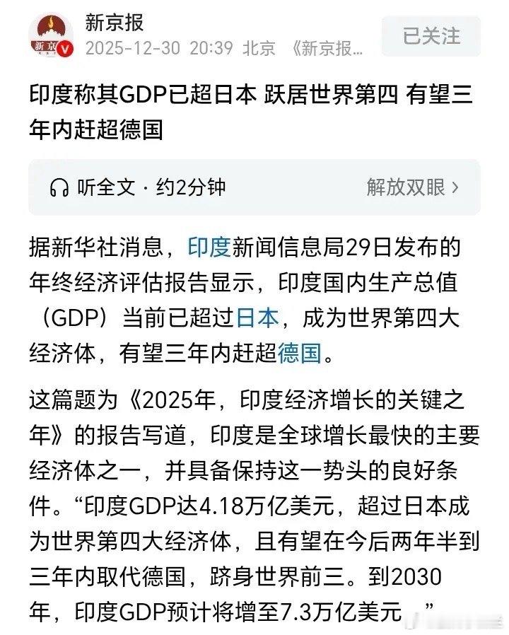 印度刚刚宣称GDP超过日本,跃居世界第四,仅次于美国、中国和德国。并且目标是三年内再赶超德国,成为世界第三大经济体。印度年终经济评估报告称2025年GDP4.18万亿美元,超过了日本。到2030年印度GDP将达到7.3万亿美元。这里需要注意,印度官方数据还是预测,不是最终数据。而且印度是按财年(4月至次年3月)统计,日本则按日历年;即便两国最终GDP数据,印度2025财年超日本2025日历年,也存在统计周期错位。2024年GDP数据显示印度3.91万亿美元,日本4.02万亿美元,印度仍低约0.11万亿美元。即便印度GDP超过日本,人均GDP上差距还非常大,日本约3.3万美元,印度仅约2900美元,日本超过印度的11倍。当然印度现在确实是全球主要经济体中经济增长最快的国家。2025-26财年第二季度,印度实际GDP同比增长8.2%,高于上一季度的7.8%,也高于2024-25财年第四季度的7.4%。印度经济增速明显比美国、中国、德国、日本等全球主要经济体高出很多。