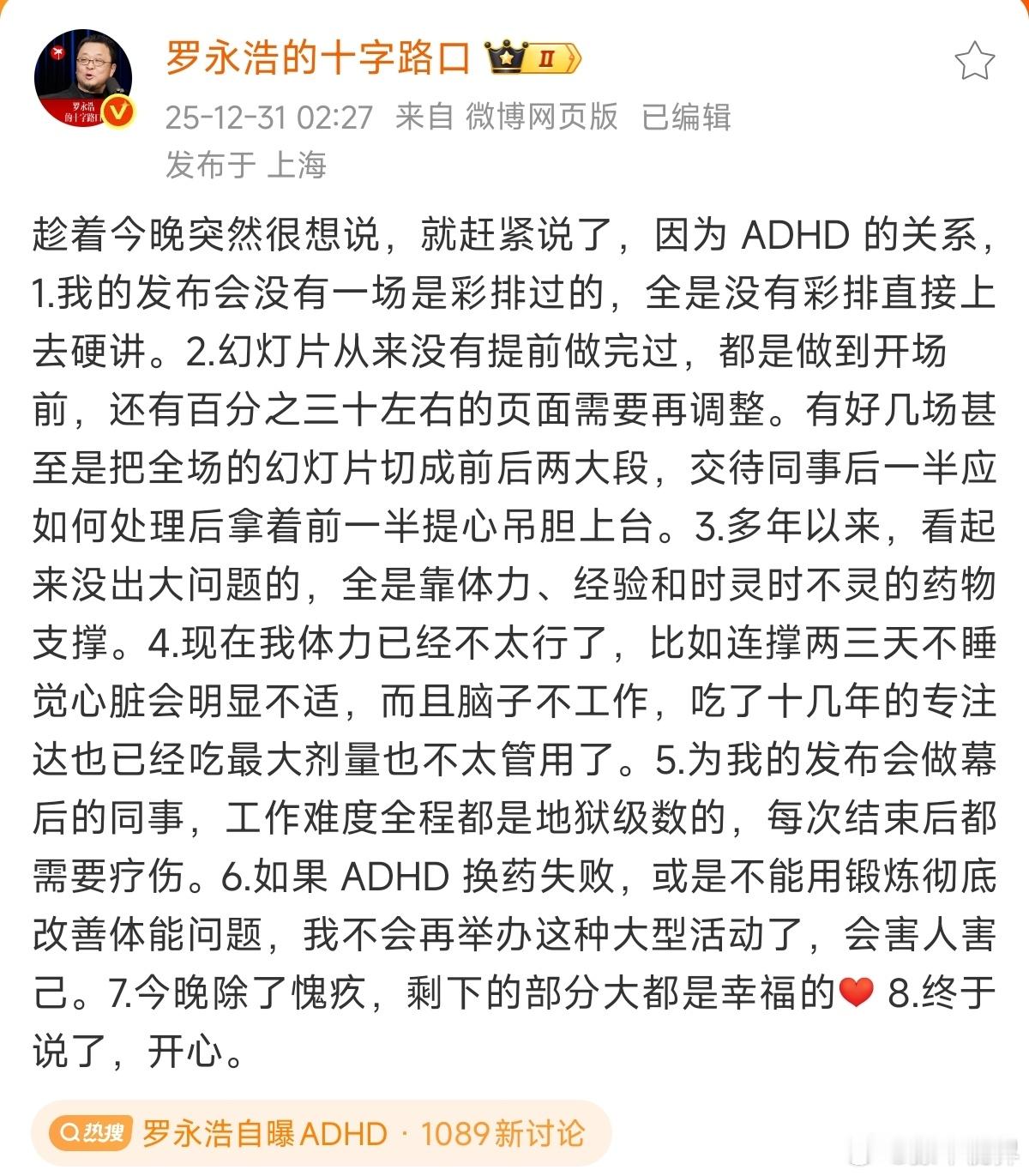 罗永浩自曝ADHDADHD 热搜一个接一个,和豆包吵架、全额退票,现在是ADHD。不彩排就干的老罗,真不适合再办这种活动了,昨天看直播,整场下来在「活动界」应该算是「灾难级」的了。好在,他是罗永浩。