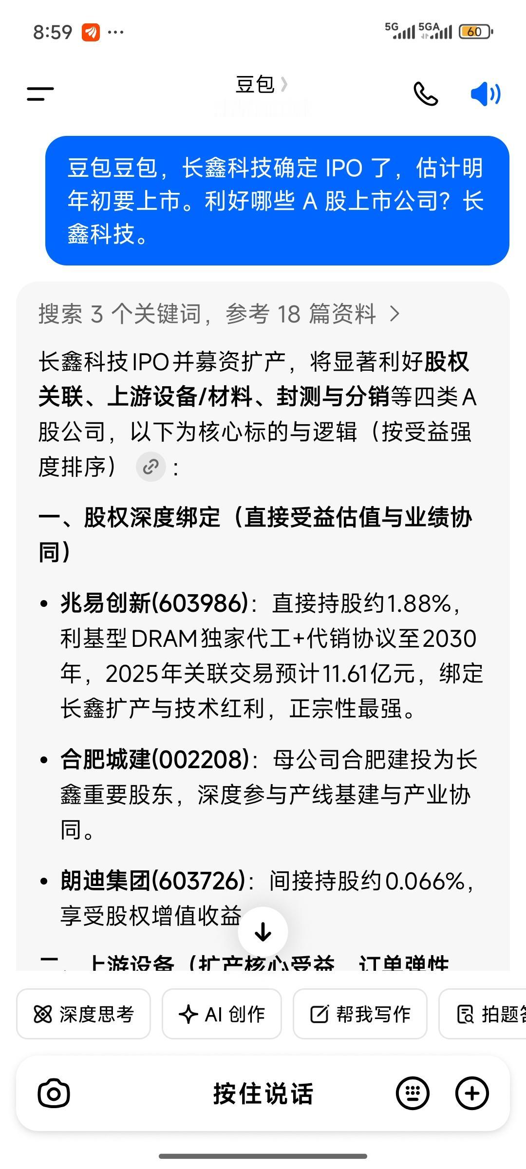 一早传来利好消息,长鑫科技,其 IPO 已获预受理。估计再过一两个月可能就要上市了。当下国家对科技股的扶持力度极大,对于先进科技企业,上会的速度和效率也格外高。此前摩尔线程上市引发了相关系列科技股的炒作,以和而泰为代表,在其上市前后一两个月股价就实现了翻倍。我想长鑫科技的上市,同样会带动相关股票掀起一轮疯狂炒作。 朋友们,又到了好好把握这次机会的时候了。我咨询了豆包,梳理了一下核心标的。大家可以找找看,哪一只股票更适合参与,咱们且抓住这机会。 长鑫存储 长杰科技 长鑫内存 中鑫科技 长鑫建设集团 浏阳长鑫 长鑫财务