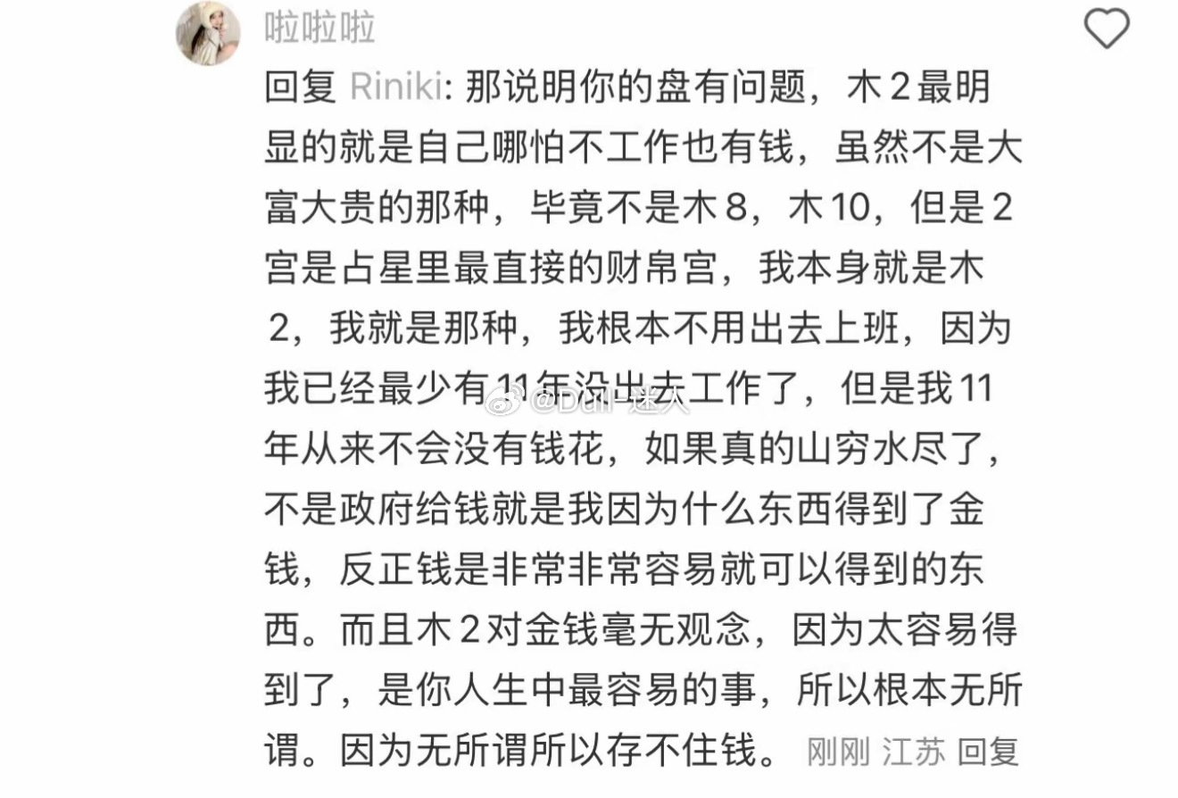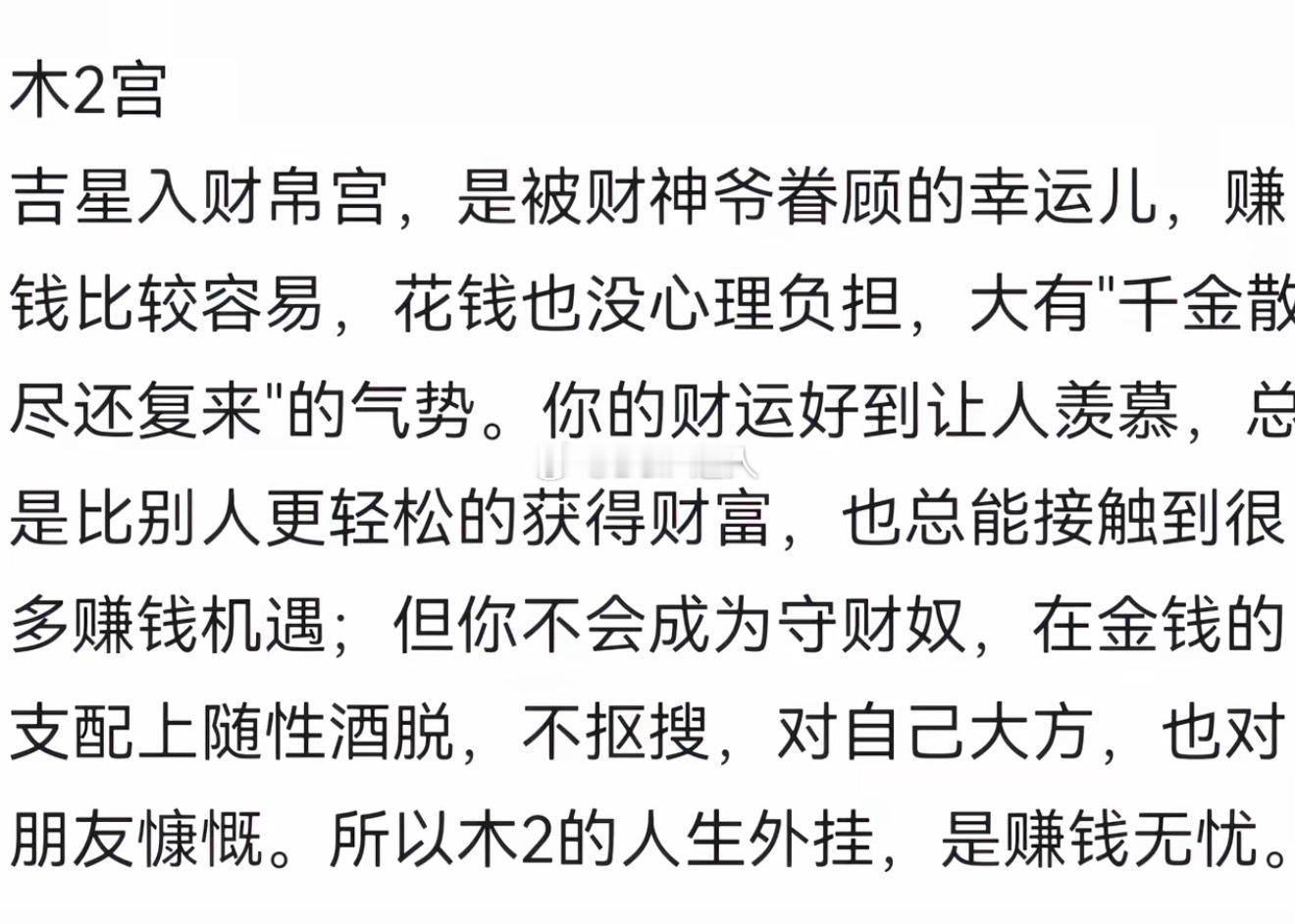 刚刚看一个博主说木星落在什么宫位,就代表天赋所在然后心惊胆战满怀期待气势汹汹的打开了测测木星二宫不工作也有钱花总是会在花完钱的时候莫名其妙得到一笔钱虽然不是什么大钱,也足够衣食无忧但对钱没有概念,花钱大手大脚“今朝有酒今朝醉”“千金散尽还复来”我去,这不就是我(所以,你们木星在什么宫)