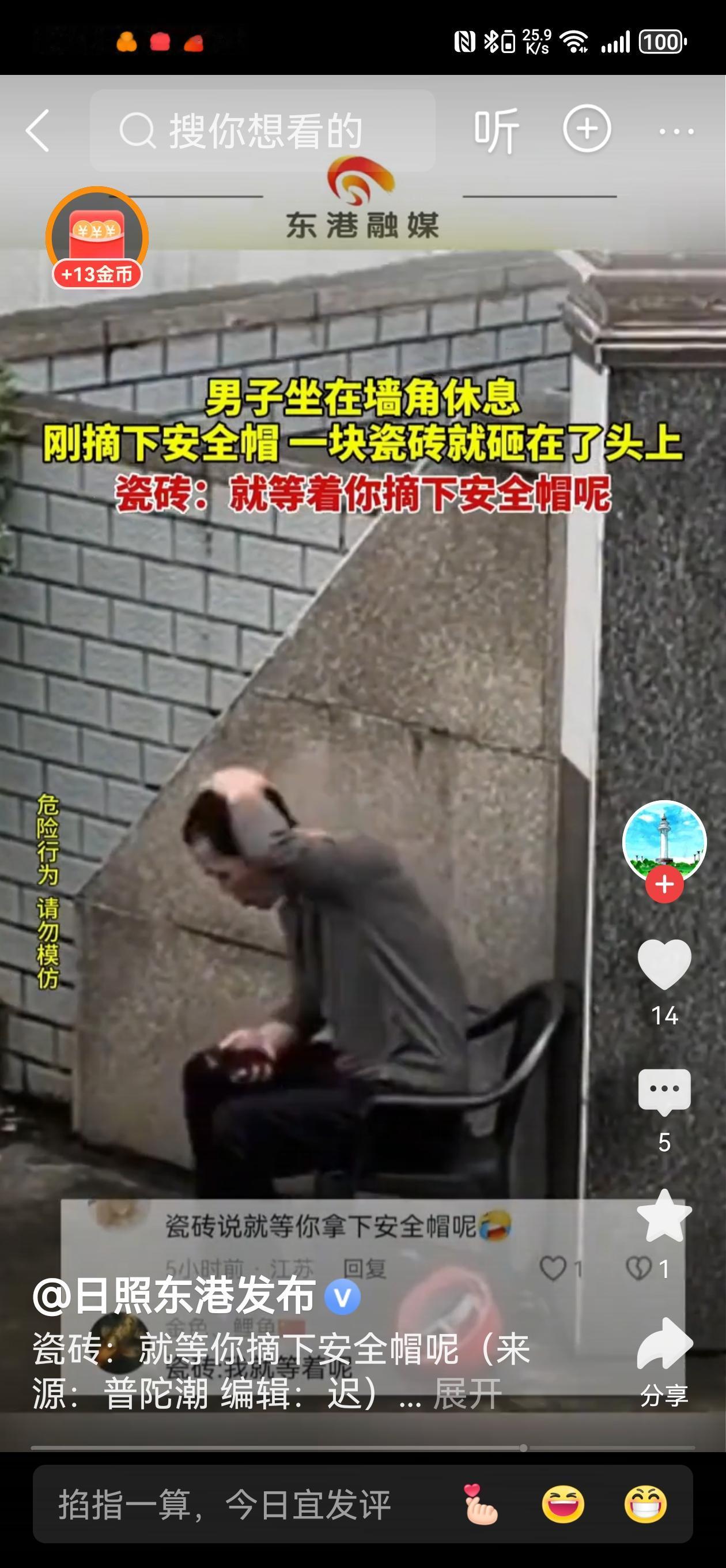 是巧合吗?男子刚摘下安全帽瓷砖就砸他头上! 这真是令人毛骨悚然的一幕,似乎充满了巧合与戏剧性。男子刚刚摘下安全帽,瓷砖就突然砸在了他的头上,这样的场景难免让人联想到“天意”或“巧合”的安排。 如果从事件本身来看,可能存在多种解释: 纯粹的巧合:瓷砖掉落的时间刚好在男子摘下安全帽的瞬间,纯属偶然。这种巧合在日常生活中虽然罕见,但也并非不可能。 潜在的安全隐患:如果现场瓷砖松动或施工不当,掉落的风险就大大增加。男子刚好在瓷砖松动点附近,可能只是巧合,也可能是施工管理上的疏忽。 人为因素或阴谋:也有人会联想到是否有人蓄意安排,或是某种阴谋,尤其是在一些悬疑剧情中,这样的巧合常被用来制造悬念。 无论如何,这一事件提醒我们,安全隐患无处不在。施工现场、危险区域,及时检查、加强管理,避免类似的意外发生,才是最重要的。对于男子来说,事发后应立即接受检查,确保没有受到严重伤害。 这起巧合事件,也让我们再次意识到:生活中充满了不可预料的瞬间,有些巧合令人惊叹,有些则提醒我们要时刻保持警惕。希望每个人都能在日常中多一份细心与安全意识,避免类似的“巧合”变成不可承受的事故。