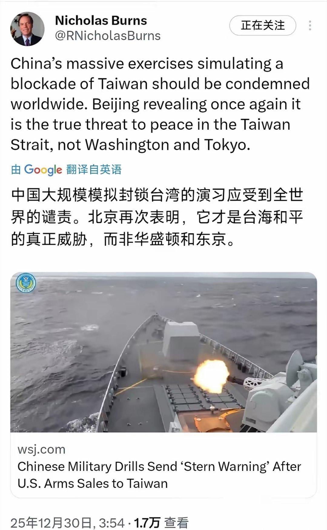 这次对台围岛演习最大的看点,不是武器装备,而是对台作战的"冷启动"能力——昨天宣布,今天开打,打破了提前多日宣布演练的常规惯例。 陆海空和火箭军四大军种完成近似"静默"的大规模隐蔽调动与作战展开,这让台岛乃至美国极其仆从国都始料未及。 东部战区发布的一段短视频凭借震撼的火力展示与精准的战术呈现,迅速引发全网热议。 视频中四大战术杀招所释放的硬核威慑力,成为公众与媒体聚焦的核心。 从远空到近域,从精准点杀到全域压制,这段视频不仅展现了人民军队的现代化作战能力,更传递出捍卫国家主权与领土完整的坚定决心。 不过,美国前驻华大使伯恩斯叫嚣:“中国大规模模拟封锁台湾的演习应受到全世界的谴责。北京再次表明,它才是台海和平的真正威胁,而非华盛顿和东京。” 对此,你想说点什么呢?