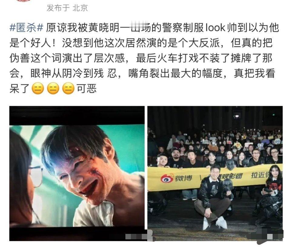 这还是我认识的黄晓明吗谁看《匿杀》的黄晓明不想报警!从前的他vs现在的“毁形象”角色,反差拉满。蔡民安表面温文尔雅,内里藏满算计与疯狂,前期有多帅后期就有多让人脊背发凉。一场变脸笑连拍二十多遍,他把伪善的层次感演到极致,两极反转惊艳,这份角色张力真的让人狠狠代入,后劲太足!