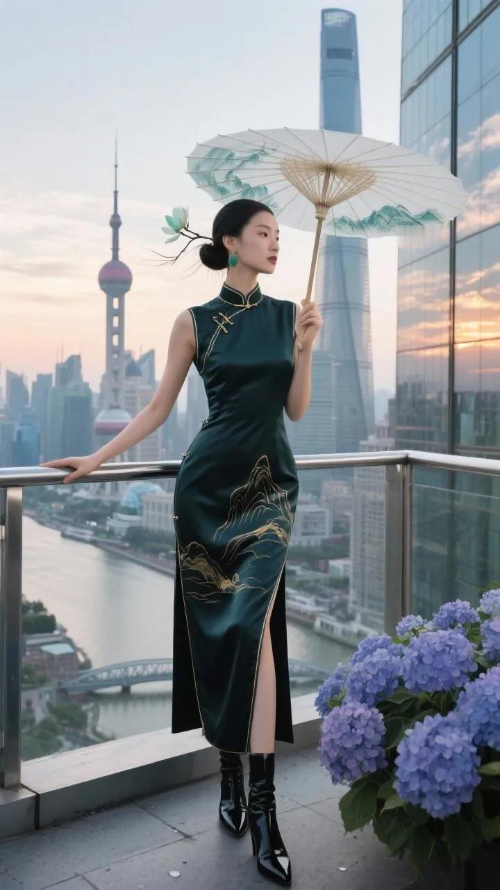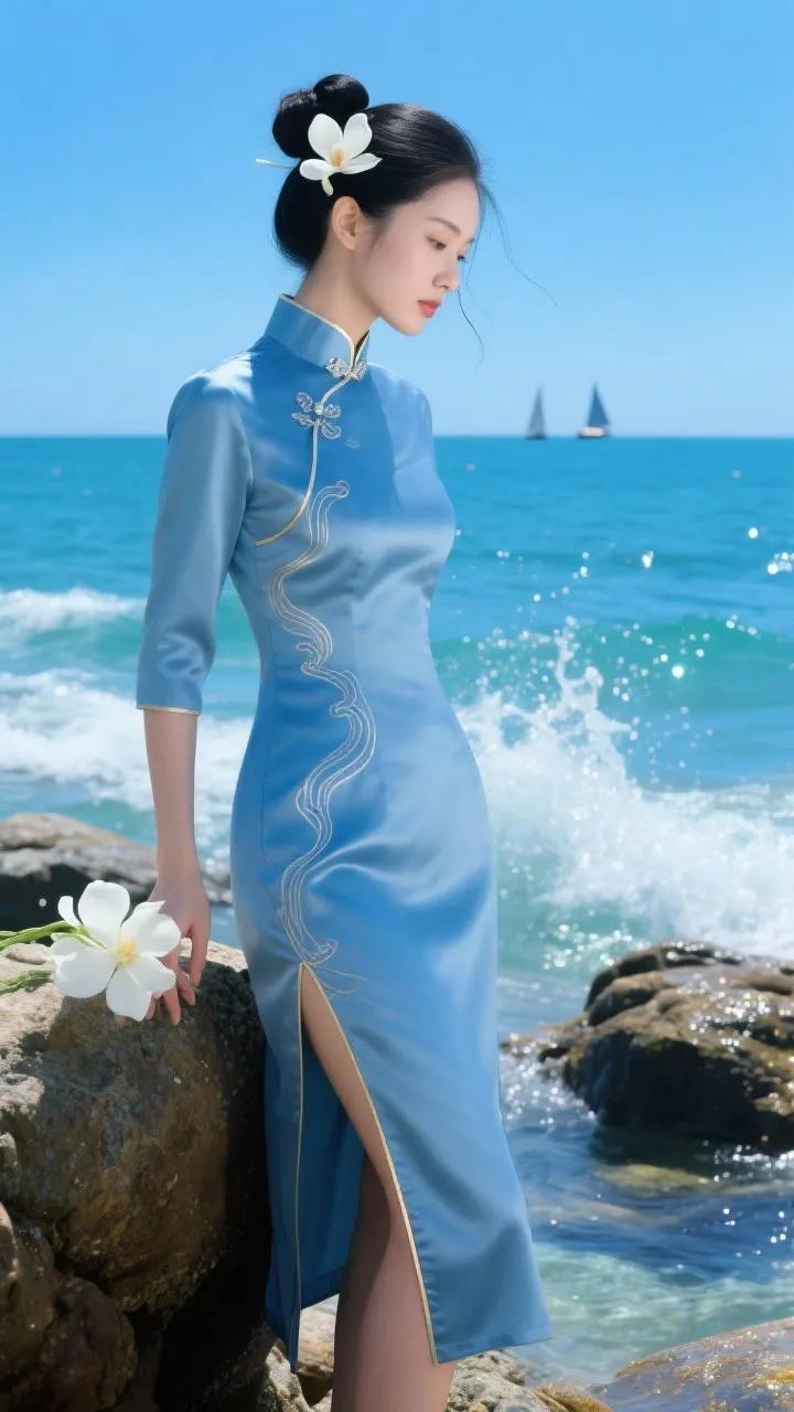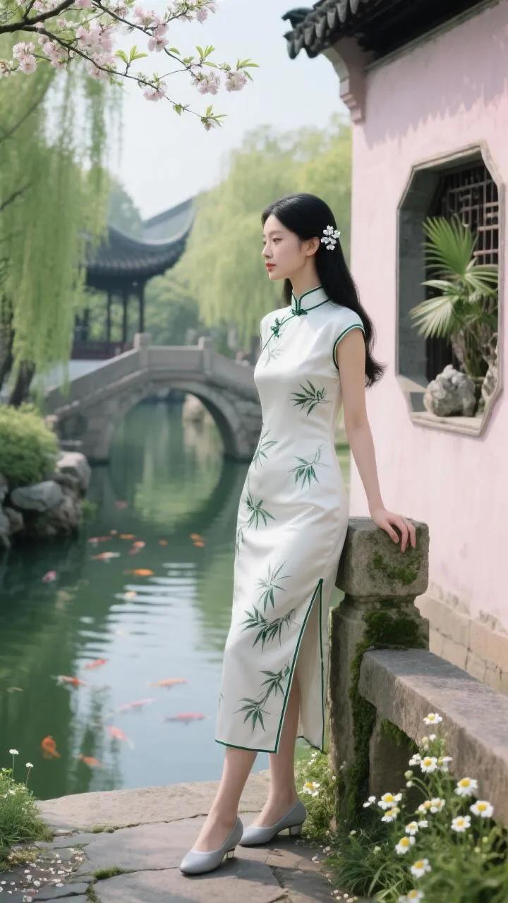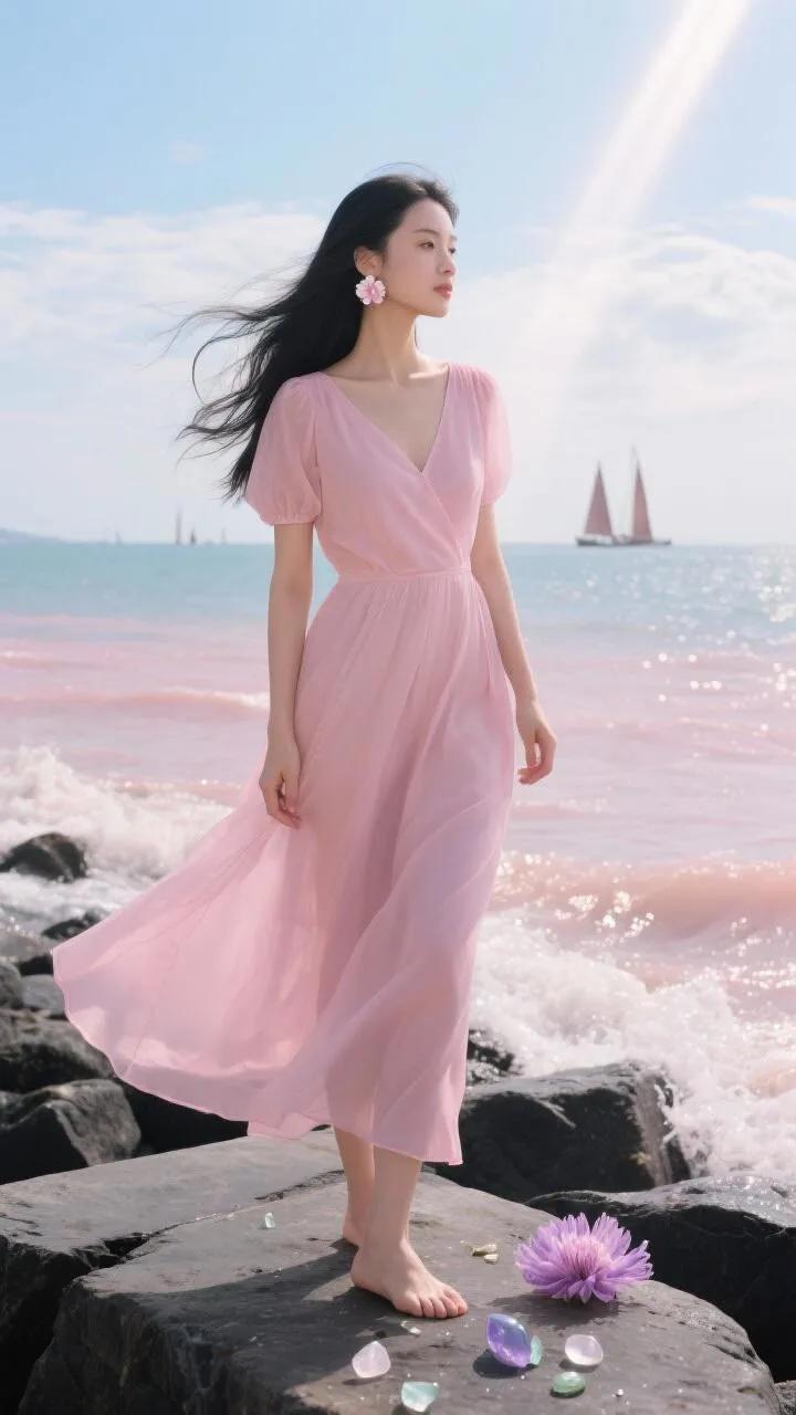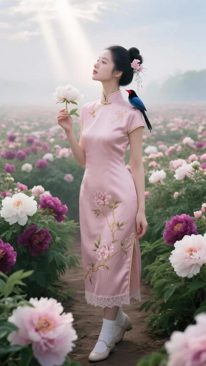 粉裙少女与花海,鸟儿相随,唯美如画。
