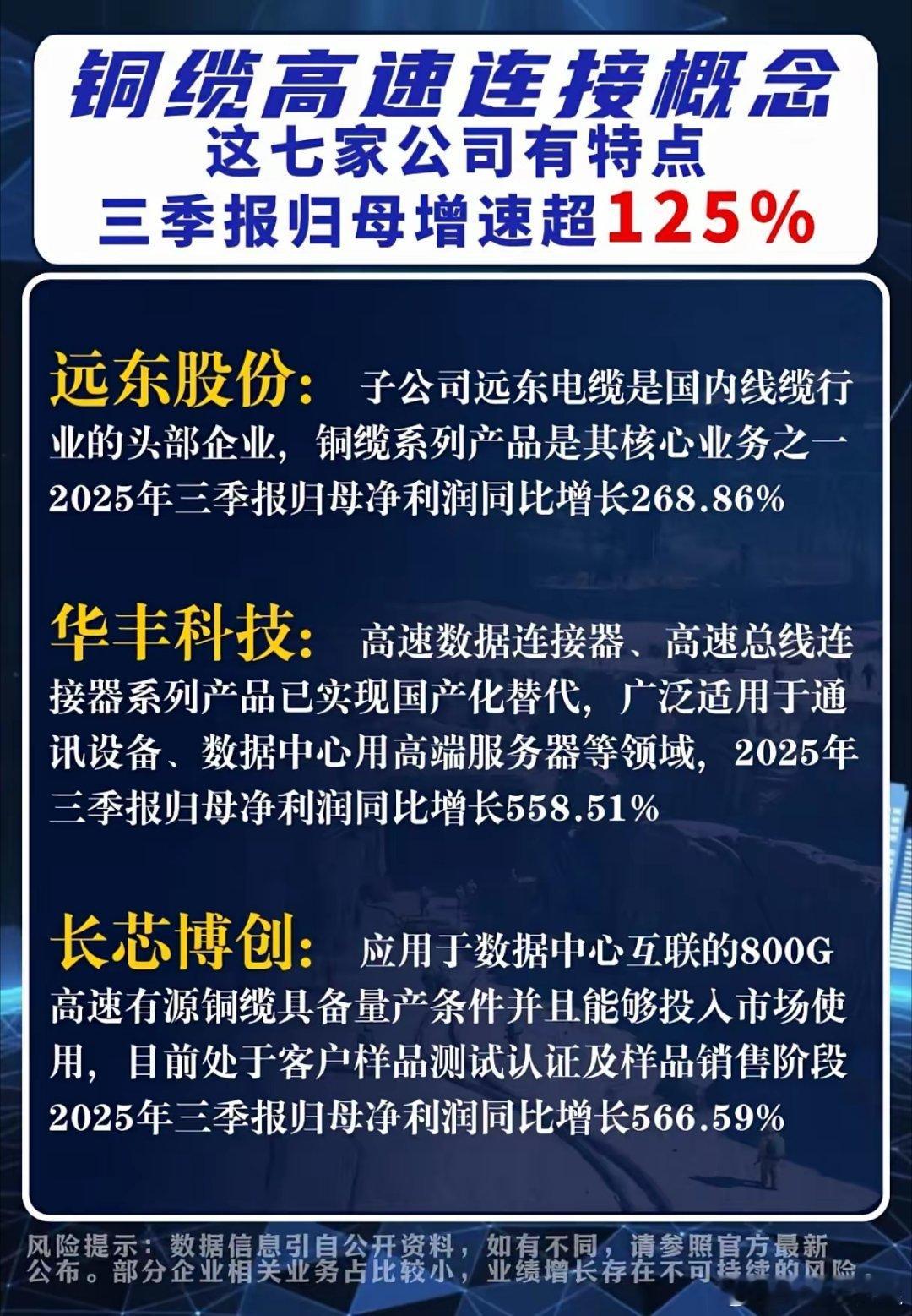 铜缆高速连接赛道藏着多少惊喜?七家公司净利增速超125%!当市场还在热议光模块、算力芯片等热门赛道时,铜缆高速连接这一细分领域悄然迎来爆发,七家相关企业2025年三季报归母净利润增速齐刷刷突破125%,成为资本市场中一抹亮眼的“黑马色”。鼎通科技以125.39%的增速踩线达标,其高速背板连接器组件、I/O连接器组件是5G基站、数据中心的核心配件,精密结构件与壳体的技术壁垒让其在细分市场站稳脚跟;创益通的高速背板连接器深度绑定5G通信基站机柜与数据中心,135.74%的净利增长,印证了数据传输基础设施的需求热度;宝胜股份的SFP5650G高速线缆直击数据中心、高性能计算场景,138.08%的增速体现了高端线缆产品的市场竞争力;得润电子的I/O连接器、光模块连接器覆盖服务器与信息通信领域,157.68%的增长更是展现了多领域布局的优势。而远东股份、华丰科技、长芯博创的增速则堪称“炸裂”,远东股份依托子公司远东电缆的铜缆核心业务,净利增长268.86%;华丰科技的高速数据连接器实现国产化替代,558.51%的增速彰显国产替代的强大势能;长芯博创的800G高速有源铜缆已具备量产条件,566.59%的增长让市场看到了下一代高速连接产品的潜力。不过值得注意的是,部分企业相关业务占比较小,业绩增长的可持续性仍需观望。但不可否认的是,在数字经济与算力基建的浪潮下,铜缆高速连接赛道的技术突破与市场需求共振,正让这一细分领域从“配角”走向“主角”,未来能否持续领跑,值得投资者持续关注。