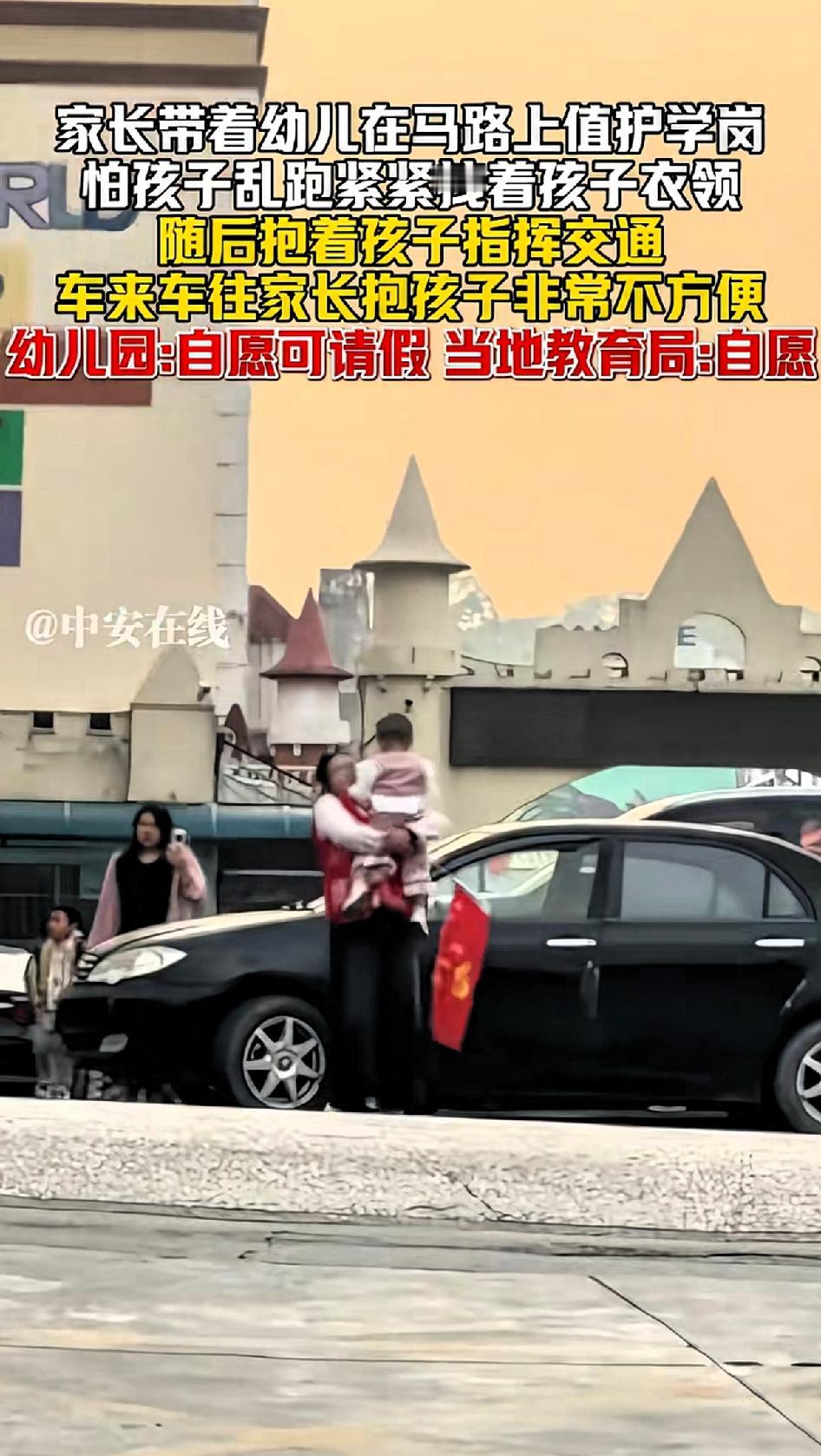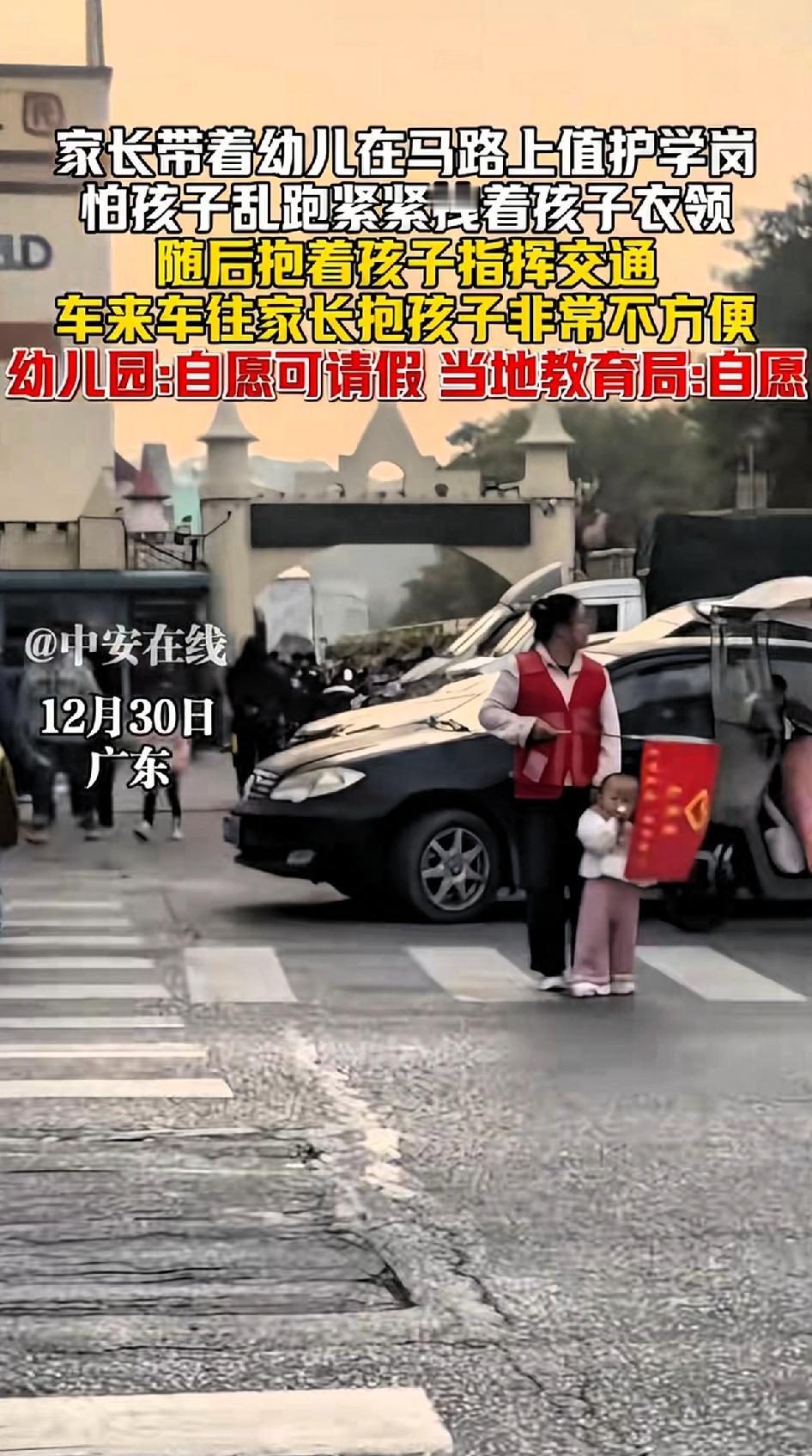 家长带着幼儿在马路上值护学岗怕孩子乱跑紧紧拽着孩子衣服,看到这位家长一刻也不敢放松。 广东深圳宝安一家幼儿园外,家长带着小娃娃在马路中间值护学岗。 车来车往,家长紧紧拽着孩子衣领,生怕孩子乱跑,之后甚至抱着孩子指挥交通,明明自顾不暇,却还要身兼重任。车辆穿梭 不停,最该被保护的人却来指挥交通。 幼儿园称是自愿的,家长有事可请假,但这说法怎么听都变味。教育局也强调自愿,不准强迫,可实际中,老师在群里发安排表,备注“请家长尽量配合,如有特殊情况请提前请假”,这让家长哪敢不参加。 这个带娃的家长,抱着孩子去值岗,怎么看出来是自愿的?明明不是自愿的,自己带着幼儿都自顾不暇了,还要去轮岗!群里都的排班表都排好了,会有人不去吗?谁敢不去,真不去又怕孩子在班级受排挤。 很多家长即便不愿意,也怕影响孩子,只能硬着头皮上,实在没人看孩子就只能带娃一起。这种护学岗制度,到底是守护安全,还是转嫁责任,值得深思。