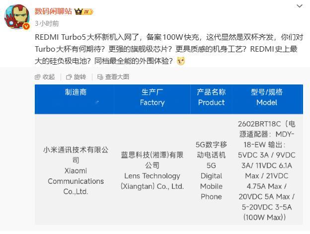REDMI Turbo5大杯新机入网了,100W快充配多大的电池?