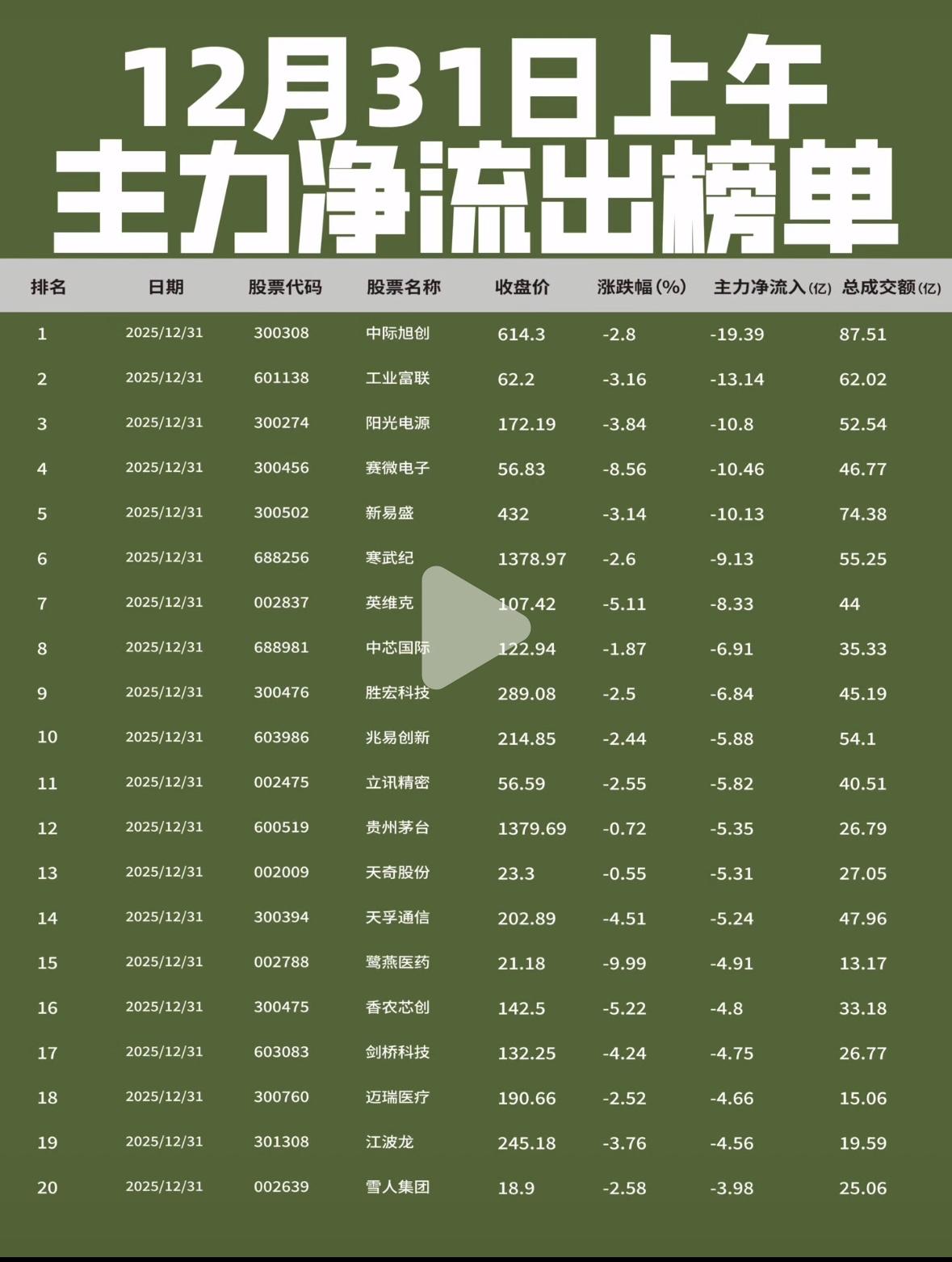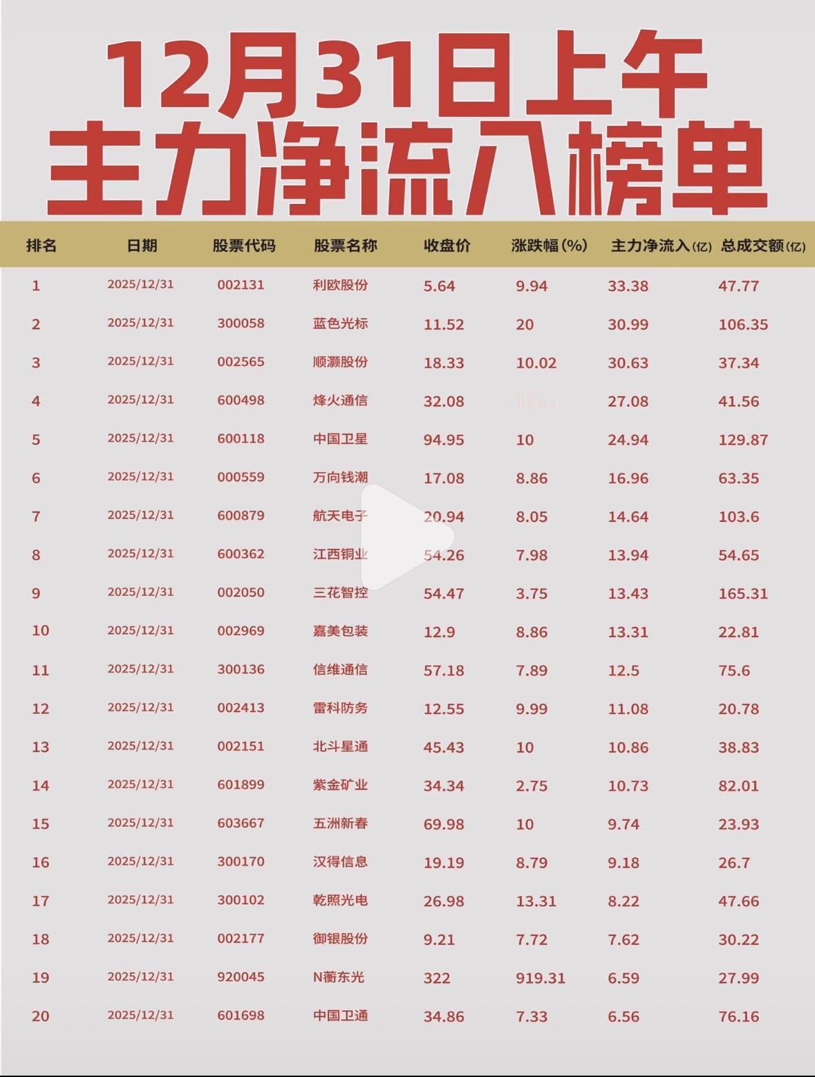 12月31日主力净流出榜单揭晓! 12月31日主力资金青睐多只个股, 通信、卫星、矿业等板块表现活跃, 部分股票涨幅显著。