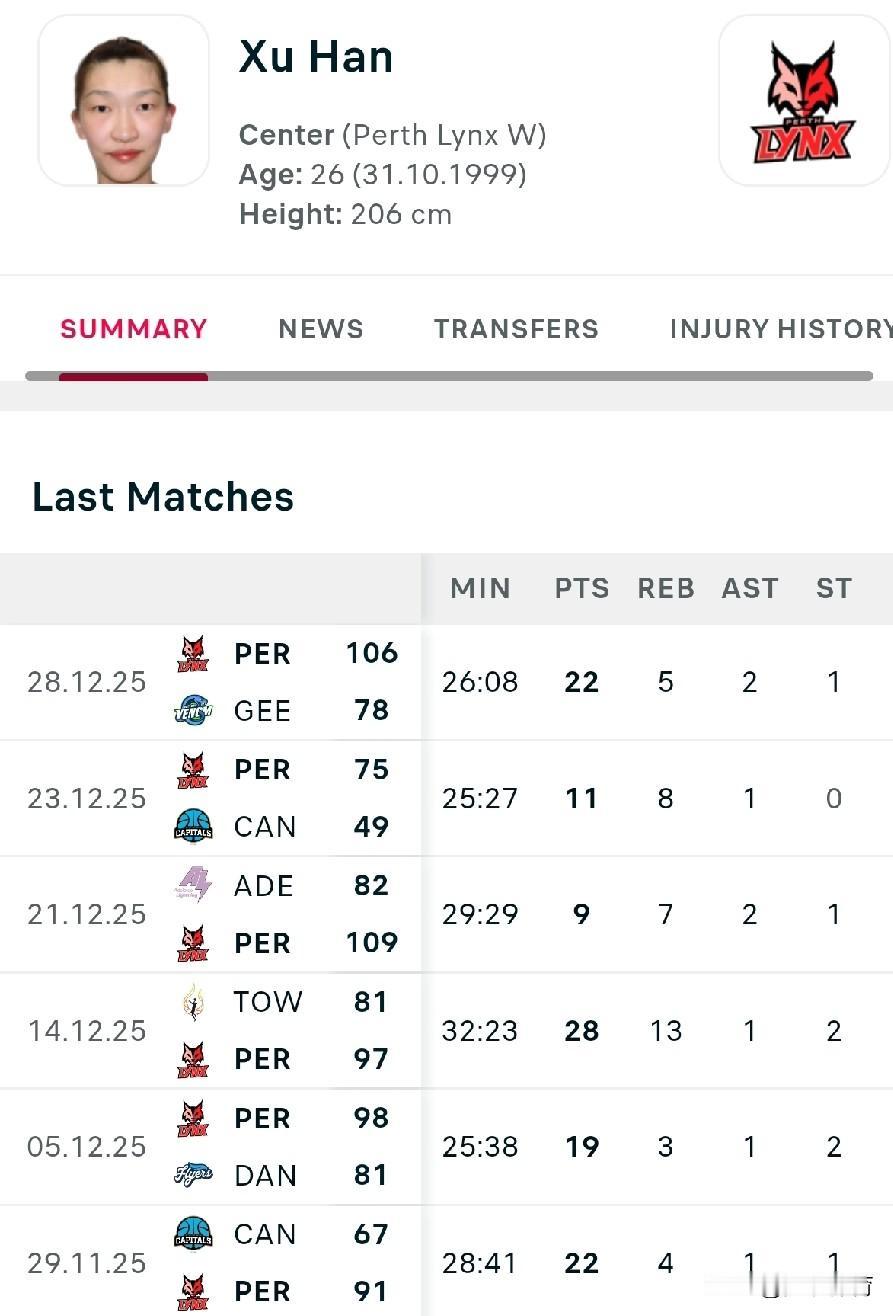 近一个月,韩旭在澳洲女篮联赛中的表现 从2025年11月29日到12月28日近一个月的时间里,韩旭总共打了6场比赛,球队六战六胜: 11月29日球队91-67获胜 12月05日球队98-81获胜 12月14日球队97-81获胜 12月21日球队109-82获胜 12月23日球队75-49获胜 12月28日球队106-78获胜 韩旭的上场时间及得分、篮板、助攻等数据统计(见图)