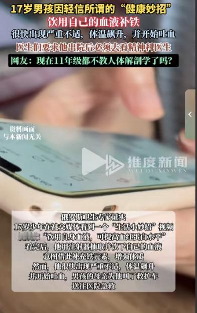 这也太炸裂了吧!俄罗斯17岁少年为补充铁元素,竟然喝自己的血液,可就在服用后不久,竟然出现了中毒的情况;但医生知道后,竟开了一张转诊单,让他去看精神科医生 在社交媒体充斥着各类“神奇养生法”的当下,有些所谓的“健康妙招”已经离谱到让人跌破眼镜。 近日俄罗斯莫斯科发生的一起事件,就给所有盲目相信网络偏方的人敲响了警钟。 一名17岁少年为了补充铁元素,竟然听从视频指导喝下自己的血液,最终中毒送医,医生在了解情况后还特意为他开具了精神科转诊单。 这名少年平时习惯在社交媒体上获取健康知识,某天刷到一条高赞视频,视频博主声称,饮用自身血液能直接提高血红蛋白水平,快速补充铁元素,比吃任何保健品都有效。 少年正担心自己可能缺铁,看着视频里博主绘声绘色的讲解和上万条“亲测有效”的评论,他没有丝毫怀疑,立刻决定尝试。 他翻出家里的家用注射器,没有进行任何消毒处理,就小心翼翼地从自己的静脉中抽取了约5毫升血液。 看着针管里鲜红的液体,他按照视频里的说法,毫不犹豫地一饮而尽,甚至还觉得这种“天然疗法”很新奇。 喝下血液后不到两小时,少年就感受到了强烈的不适,他的体温迅速飙升至39.5℃,浑身发烫,腹部传来刀割般的剧痛,紧接着开始剧烈呕吐,呕吐物中夹杂着暗红的血丝。 少年的母亲发现他蜷缩在沙发上痛苦呻吟,脸色惨白如纸,立刻拨打了急救电话,救护车赶到时,少年已经出现意识模糊的症状,被紧急送往莫斯科当地医院抢救。 经过一系列检查,医生确诊少年为急性中毒,需要立即进行洗胃和解毒治疗,当医生询问中毒原因,得知少年是喝下了自己的血液时,整个医护团队都感到十分震惊。 主治医生安德烈·孔德拉欣解释,人体的消化系统根本不具备分解血液的能力,血液离开身体后会快速滋生细菌,同时其中含有的尿素、尿酸等代谢废物会直接加重身体排毒负担。 过量的铁元素会灼伤胃黏膜,形成难以消化的血凝块,这些都是导致少年呕吐、呕血的直接原因。 更危险的是,少年使用的注射器没有经过无菌处理,还存在引发血液传染病的潜在风险,在病情稳定后,医生为少年开具了精神科转诊单。 这一决定并非没有依据,医生表示,这种缺乏基本生理常识的行为,背后不仅是虚假信息的误导,也反映出青少年在健康认知上的严重偏差。 需要专业的心理干预来避免类似危险行为再次发生,而这件看似极端的事件,其实只是网络虚假健康偏方泛滥的一个缩影。 在社交媒体上,类似的离谱偏方还有很多,并且都有不少追随者。 美国曾流传“兽用驱虫药能治愈癌症”的说法,源于一名晚期癌症患者声称服用狗用驱虫药芬苯达唑后肿瘤消失,这一说法经网红炒作后,吸引了大量癌症患者跟风试药。 但根据奥一网和网易新闻的报道,这种兽用驱虫药从未经过人体抗癌临床试验,长期服用会导致头晕、肝肾功能损伤等严重副作用。 还会让患者延误正规治疗,60岁以上患者的治愈率会从标准方案下的25.6%锐减至5.8%,还有被网红吹捧的“咖啡灌肠排毒法”,声称能治疗癌症、糖尿病等数十种疾病。 这些离谱的偏方能有市场,核心原因在于当下年轻人获取健康信息的方式存在严重问题。 伦敦大学圣乔治学院的研究发现,年轻一代尤其容易受到虚假健康信息的影响,他们习惯把社交媒体当作搜索引擎。 将平台上的网红“科普”当成权威知识,却缺乏基本的信息甄别能力。 而这些网红博主为了流量和带货,往往会夸大偏方效果,隐瞒潜在风险,把复杂的疾病治疗简化为“几步到位”的神奇方案,精准抓住了人们追求“低成本健康”的心理。 更可怕的是,这些偏方不仅不能治病,还会带来多重危害。 除了像俄罗斯少年这样的即时中毒,长期使用偏方还可能导致器官损伤、药物依赖等慢性问题,更会让患者延误正规治疗的最佳时机,造成不可挽回的后果。 事实上,无论是缺铁还是其他健康问题,都有科学可靠的解决方式。 面对健康问题,最正确的做法是咨询专业医生,通过正规渠道获取健康知识,而不是盲目相信网络上来路不明的偏方。 要避免类似的悲剧重演,不仅需要平台加强对健康内容的审核,打击虚假科普,更需要每个人提升信息甄别能力。 在看到“神奇疗法”“快速治愈”这类字眼时,多一份警惕,多问一句“有科学依据吗”“有权威机构认证吗”,就能有效远离健康陷阱。 俄罗斯少年的经历虽然离谱,却给我们所有人上了生动的一课,健康从来没有捷径可走,那些看似“低成本、高回报”的偏方,背后往往藏着致命的风险。 在信息爆炸的时代,唯有保持理性和批判性思维,才能在纷繁复杂的网络信息中找准方向,真正守护好自己和家人的健康。