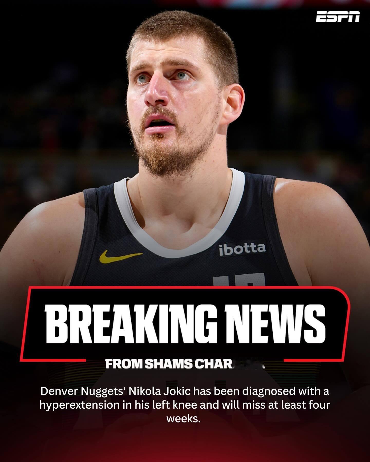 约基奇昨天因为左膝过度伸展,将在四周后重新评估伤情,掘金方面预计约基奇的伤势康复时间为4-6周。好消息是,没有结构性的损伤。——本赛季至今,约基奇场均能够得到29.6分12.2篮板11助攻,投篮命中率60.5%,三分命中率43.5%(场均投进2.1个三分),罚球命中率85.5%。——这将是约基奇生涯至今缺席最久的一段时间,他此前生涯中最长的连续缺阵长度是7场比赛。——根据赛程记录,未来四周内掘金共有15场比赛,本赛季的前32场比赛约基奇保持全勤。若约基奇能够及时回归,他仍有希望在本赛季出战65场比赛,满足常规赛MVP、最佳阵容等赛季奖项评选的入围场次要求。