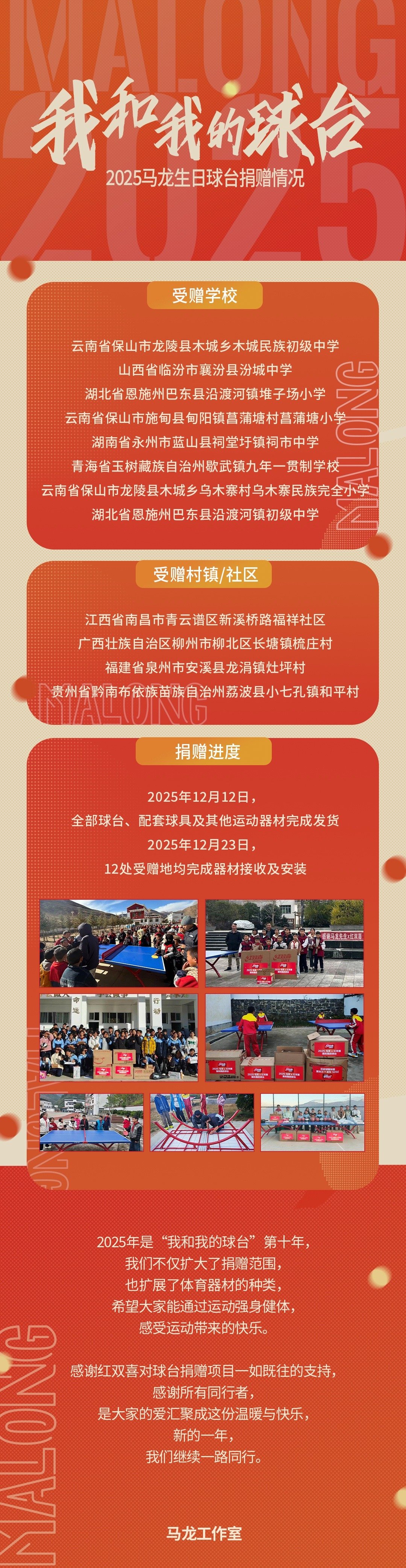 马龙球台捐赠已经十年了 马龙球台捐赠项目已经第十年了凭借对乒乓球的热爱,将球台与体育器材送到了更多角落,希望让运动的快乐触手可及,让热爱的力量在广阔的天地里生根发芽新的一年,我们继续用爱照亮更多可能马龙我和我的球台马龙