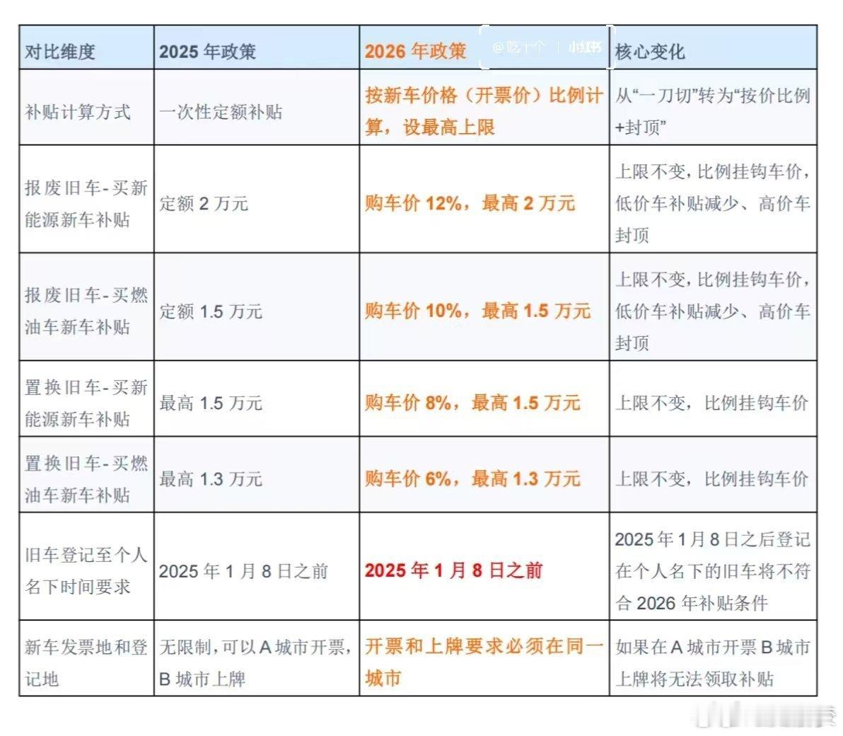 2026汽车以旧换新补贴细则这里有两张图 都对比的比较清晰了置换补贴还是有的,不过力度整体没有去年大,而且多了一些规则要求,1、更倾向高价车补贴,补贴按车价比例,新能源车是车价12%至高2万2、旧车需要1月8日就登记在名下的(囤二手车炸了,之前买二手来置换的不行了)3、新车发票和上牌需要在同一个城市(懂得都懂哈) 大v聊车