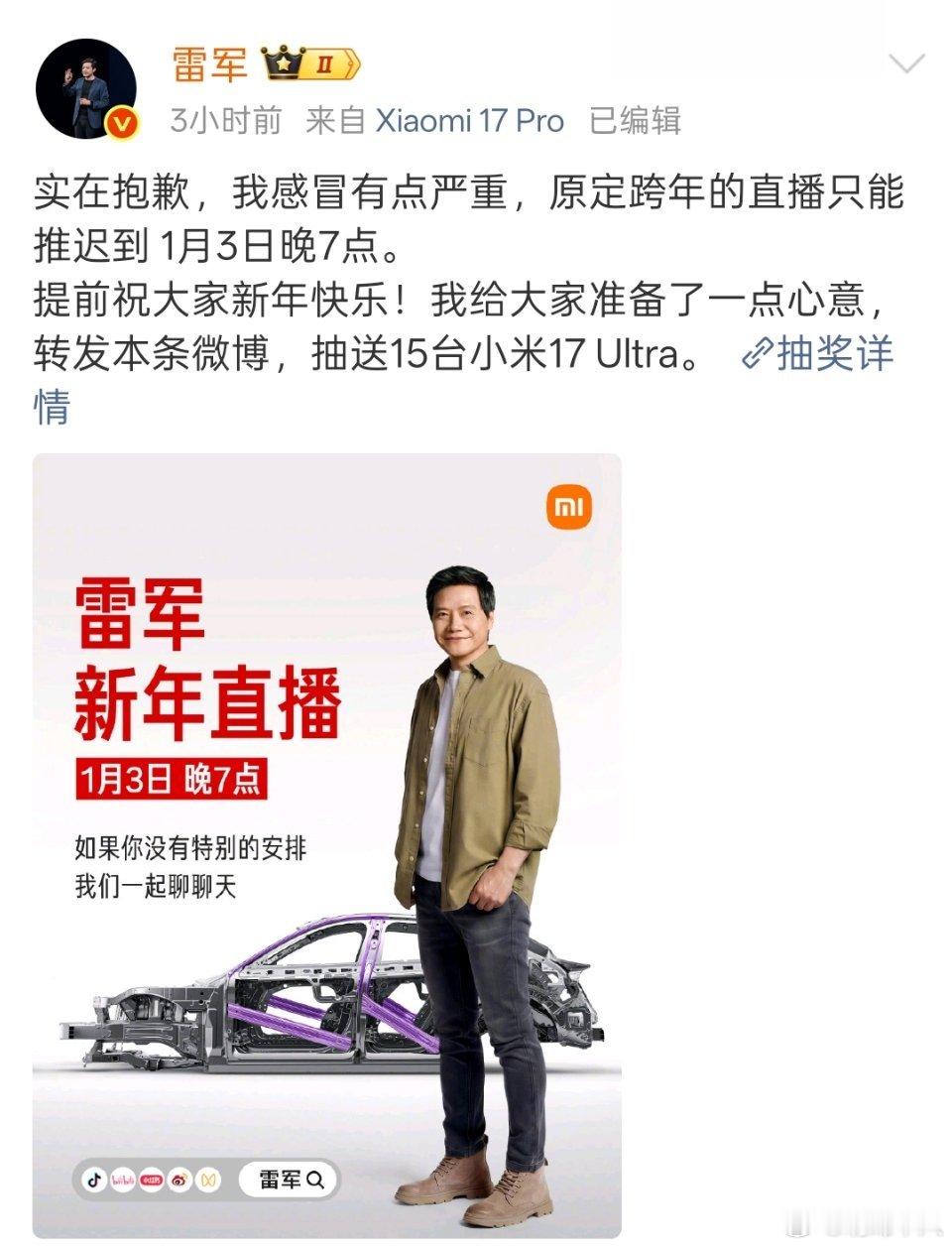 原定今晚举行的雷军跨年直播,因雷总本人感冒,推迟至1月3号晚上进行。