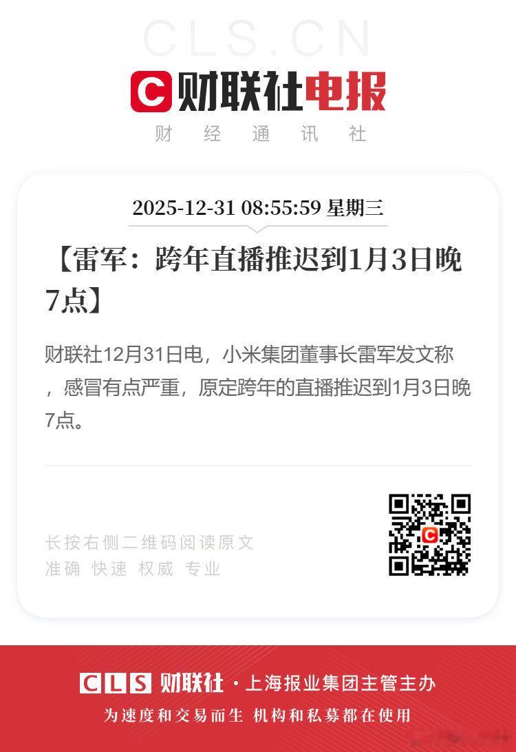 雷军请了个假,原定今晚的跨年直播推迟到了1月3日晚7点。小米汽车