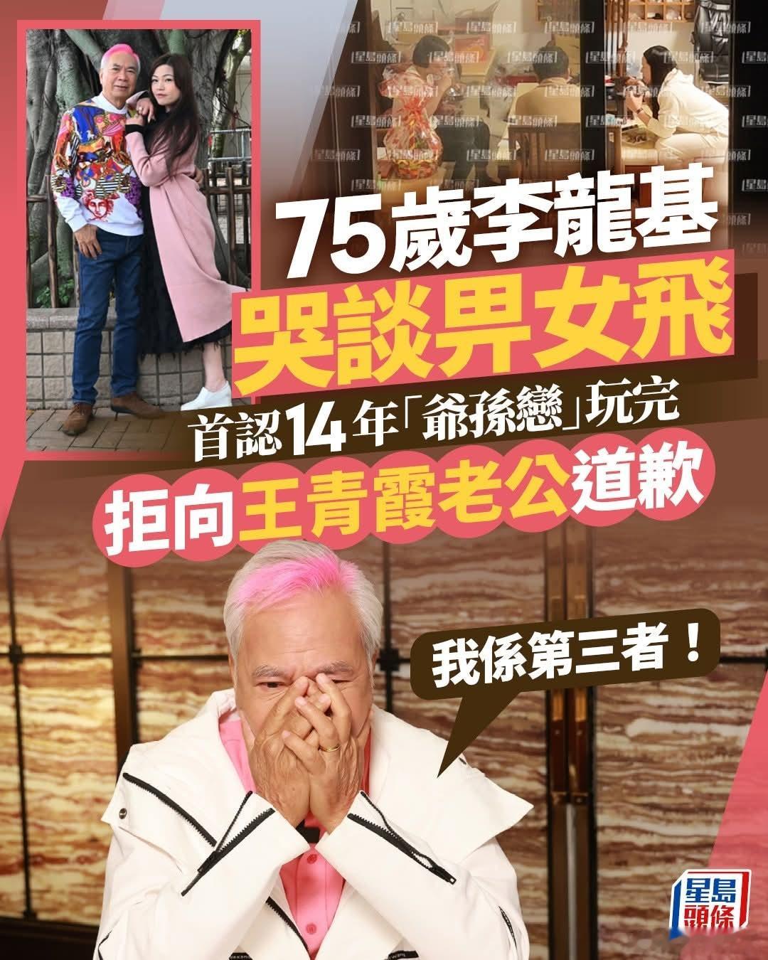 港星李龙基哭谈分手:我系第三者,首认14年「爷孙恋」玩完75岁李龙基向港媒证实被分手,直认与39岁王青霞的14年「爷孙恋」已画上句号。女方早已结婚生子,并在冬至与陈姓丈夫团聚一家人,他两度掩面落泪,坦承:「一切明白,我系第三者了,祝他们幸福!」但强调自己从不知情。李龙基曾承诺迎娶王青霞,今年7月更手捧60枝粉红玫瑰迎接「未婚妻」出狱,但此后女方便淡出公众视线。近日网友爆料,指王青霞疑长期「瞒婚」,早年已在家乡结婚并育有一名16岁儿子;直至今年冬至(12月21日),她被拍到在佛山与丈夫及母亲共进晚餐。被爆料后,李龙基回应三角关系事件,他语气平静地讲述和王青霞关系已完结:「我已经放下了,没话说,结束了。」并透露自王青霞返回内地娘家后便渐行渐远,直至冬至后正式分手:「冬至饭后我什么都明白啦,我系第三者,冬至这么重要日子都不和我过,没得瞒啦,所以她正式提出分手。我们套过后,我保证不会做傻事,亦不会伤害她,算系和平分手,依然会保持联络。」他强调不欲深究有关分手细节,此番公开回应只为呼吁媒体停止骚扰对方,又忆述当日送出狱的「未婚妻」返回内地时,自己仍不知实情,并有结婚打算,后来发生了许多事。被问是否一直被王青霞「瞒婚」?李龙基则避用「瞒婚」字眼:「站在我的立场,就算发觉有些问题,爱一个人就要相信她……我从来没问过她的婚姻状况,只系觉得这么多年的和融相处应该会有结果。」王青霞自称是“香港人才引进计划”的工程师,毕业于荷兰莱顿大学工程学硕士,后被证实为假信息。2024年,她因逾期居留、非法工作等罪被判监禁25个月。2025年7月刑满出狱后,此前有港媒爆料称她早在2007年已在佛山结婚并育有一子。粤港澳大湾区范增说家里内政外交全面委托爱妻掌握